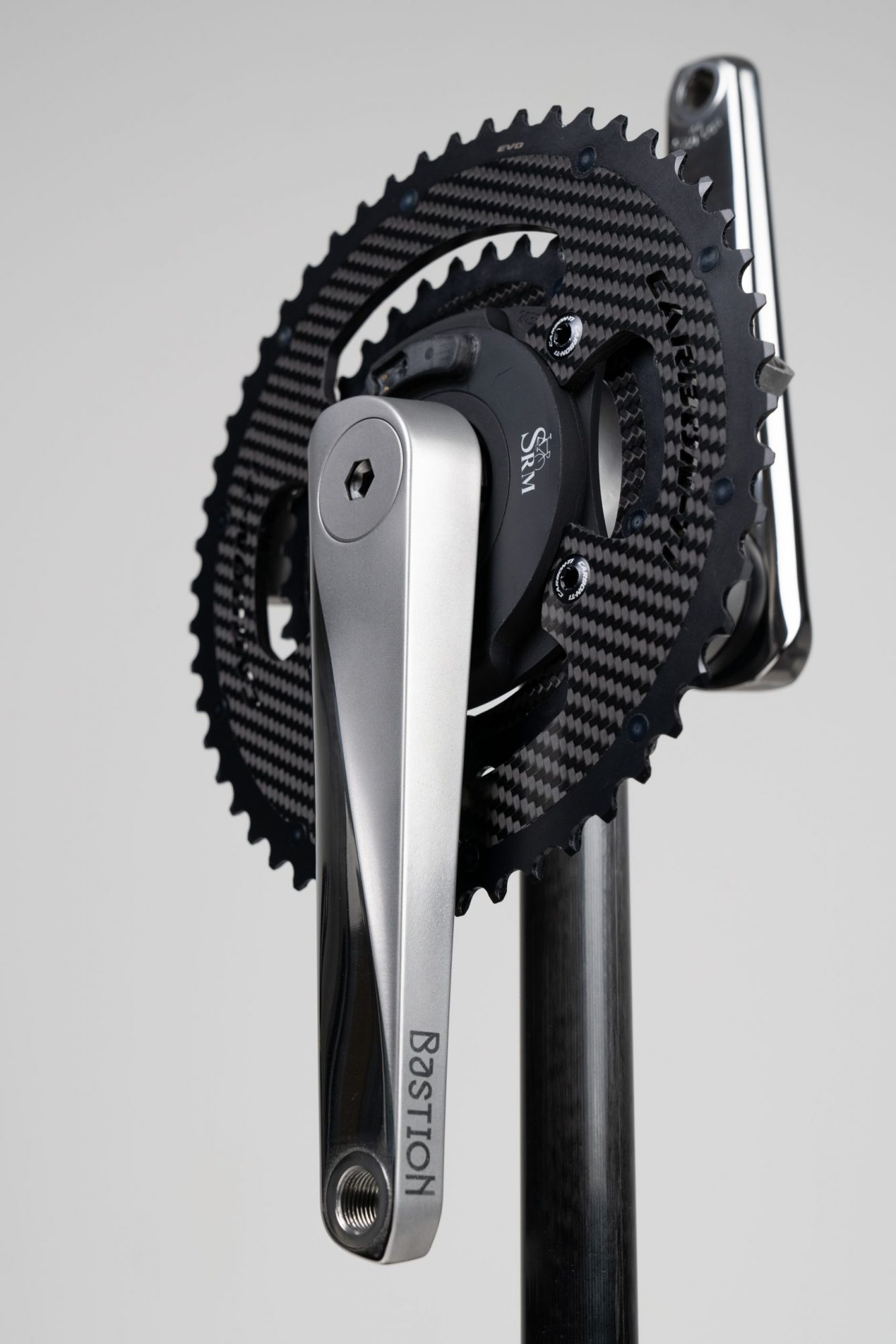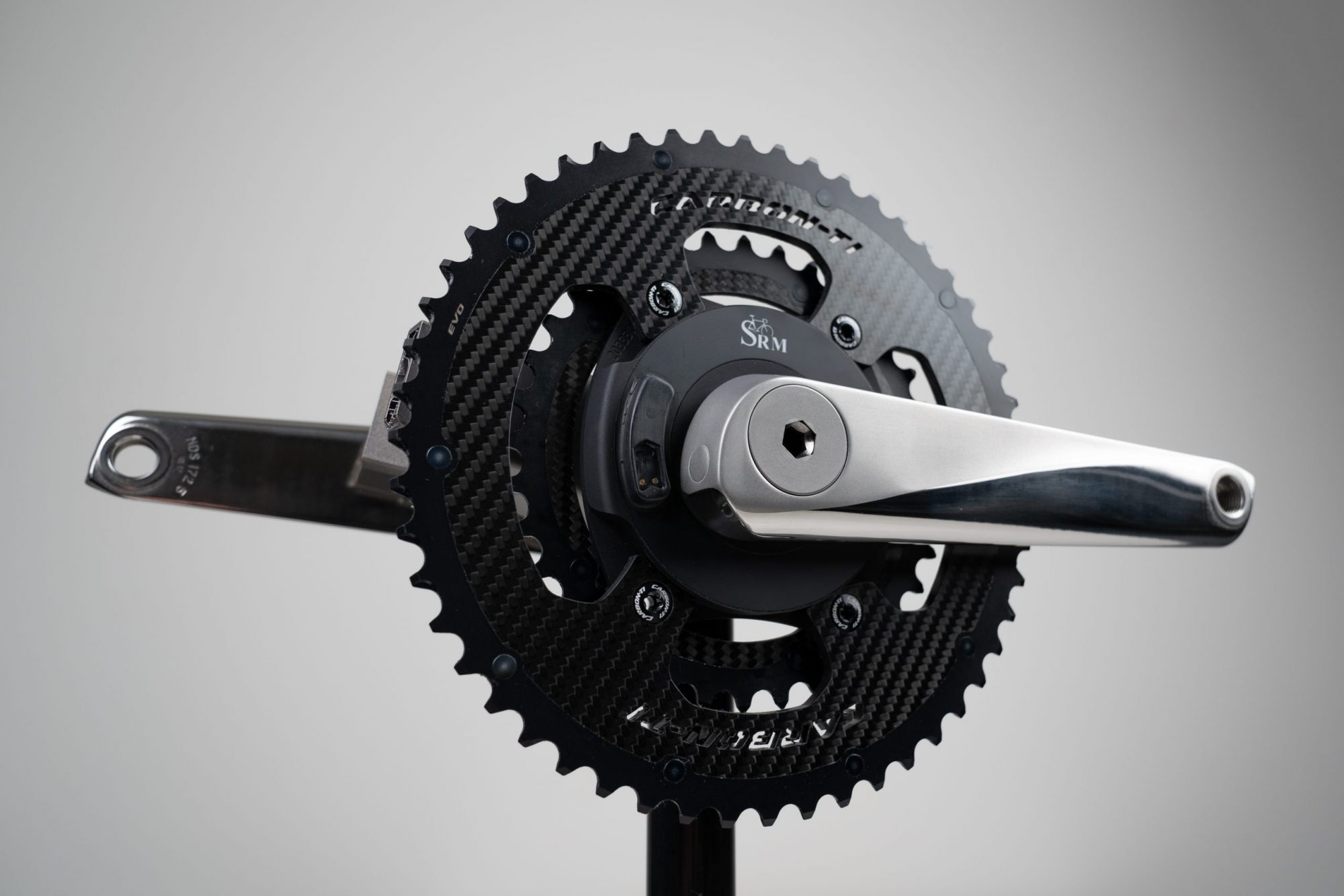The crankset utilizes a spider based powermeter which is supplied by SRM, the initial inventor of the powermeter and, to this day, a reference for accuracy an reliability. It is compatible with Shimano and Carbon-ti (4-bolt) SRAM AWS and Campagnolo chainrings.