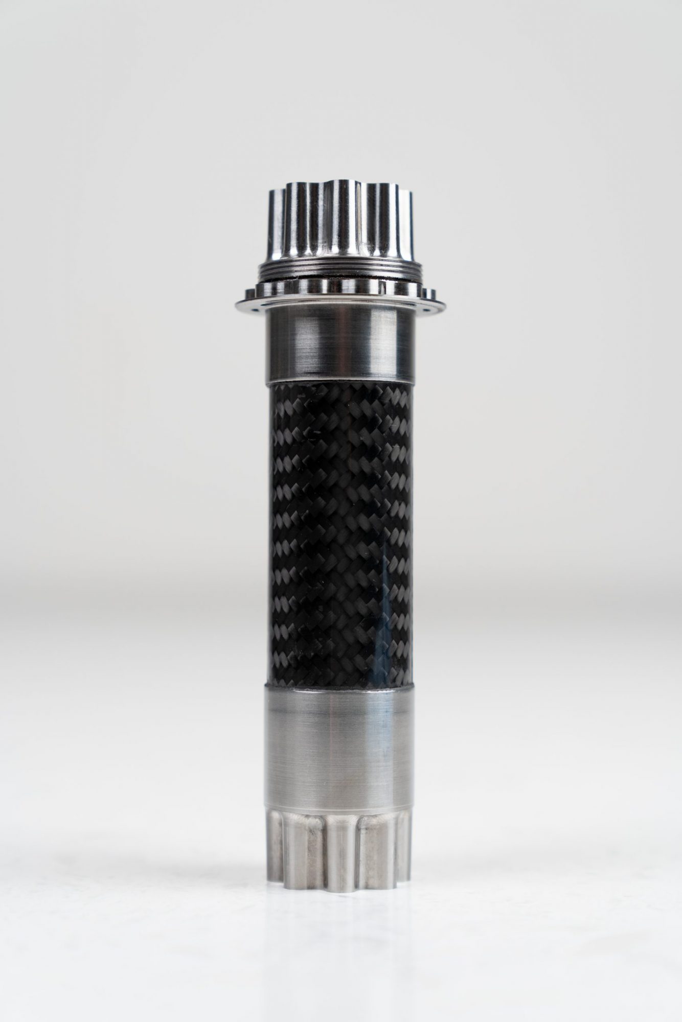 The hybrid titanium and carbon fibre spindle is a novelty in the industry, and aligns with the design philosophy of Bastion of using titanium for complex shaped and loaded parts, especially where contact is involved, and carbon fibre for simple shapes where the loads are well defined and the angles of the fibres can be aligned efficiently to carry those loads.