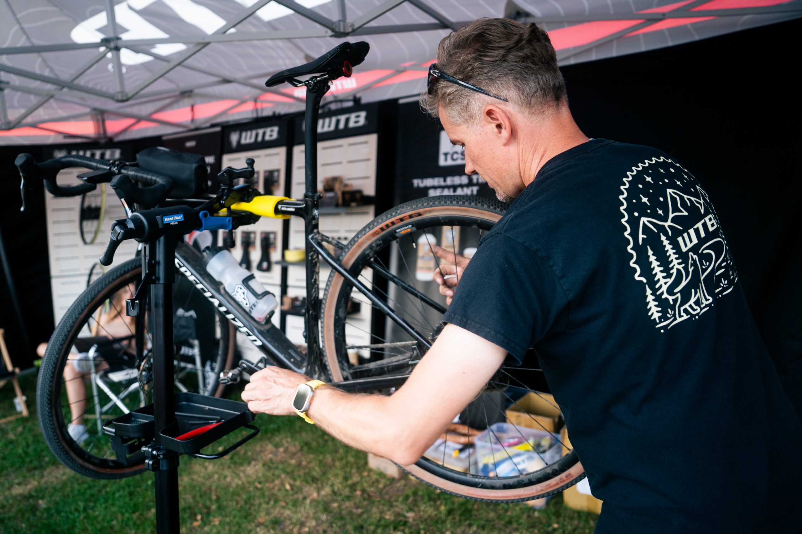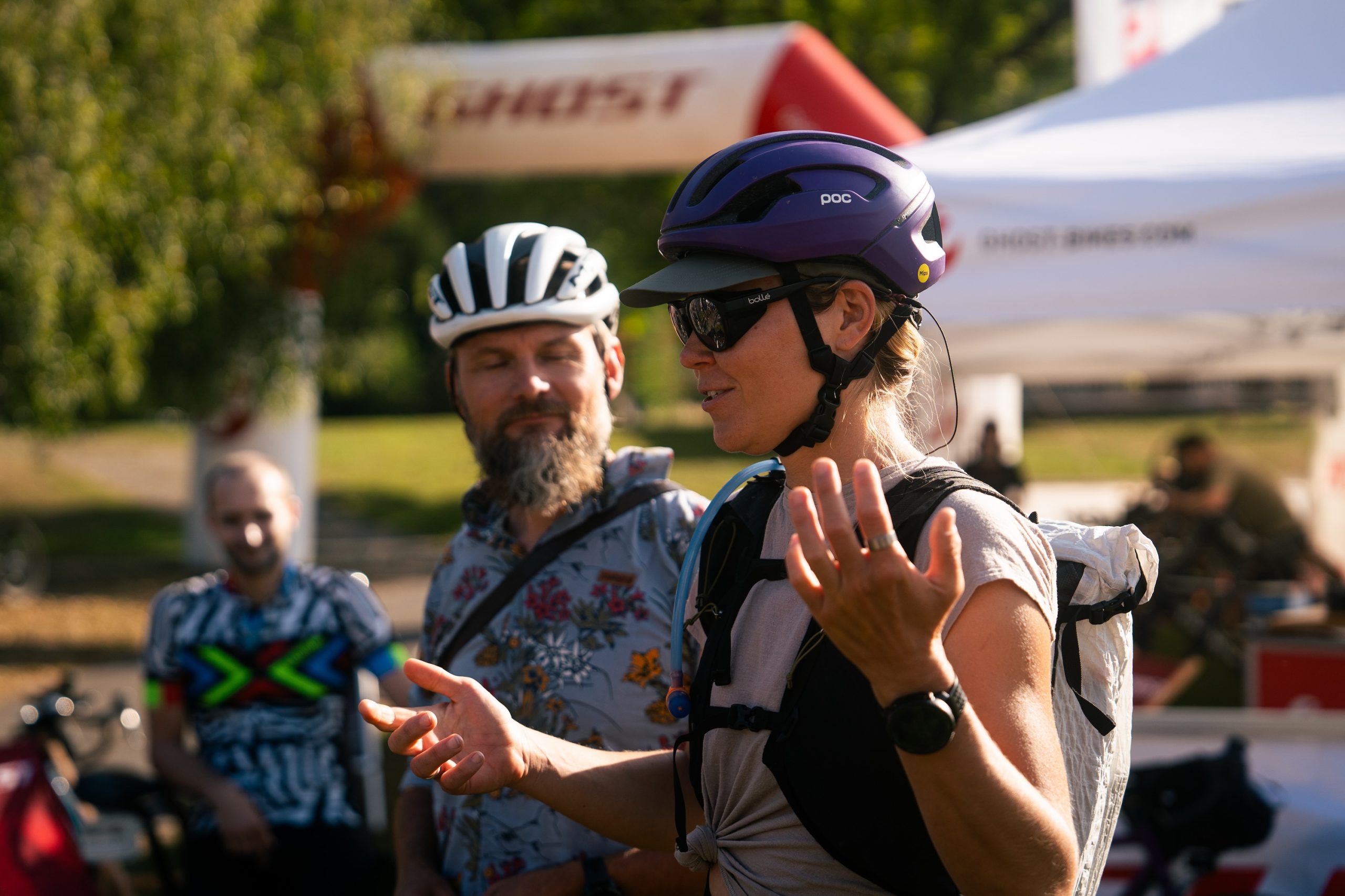 Back at camp in the afternoon, riders had time to relax and chat at the sponsors’ booths and enjoy the warm late-summer weather, which lasted throughout the camp. For those interested, Neza Peterca from What Happened Outdoors hosted an insightful workshop on outdoor clothing repair and maintenance, sharing tips valuable for everyone planning a bikepacking trip or an ultra-distance race. Impressively, Neza came to the Border Bash Camp directly from Kyrgyzstan after participating in the Silk Road Mountain Race.