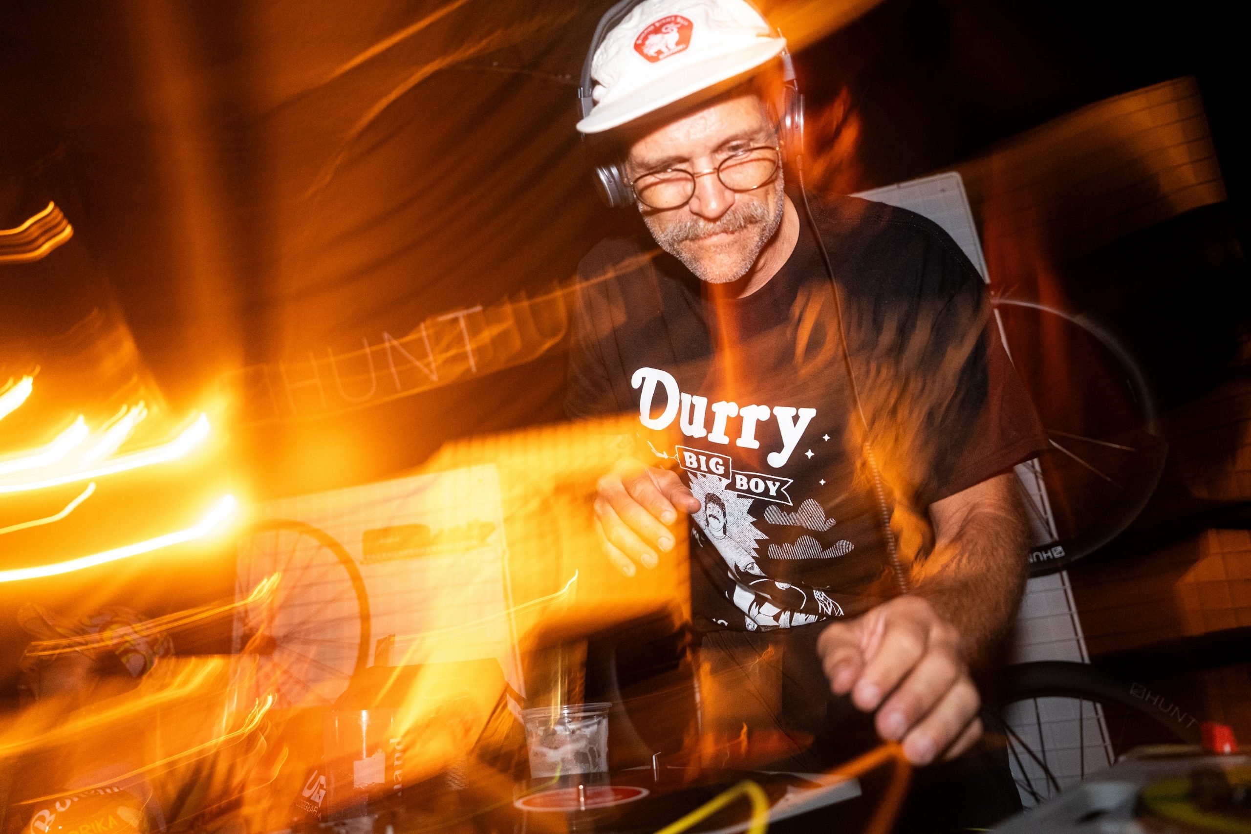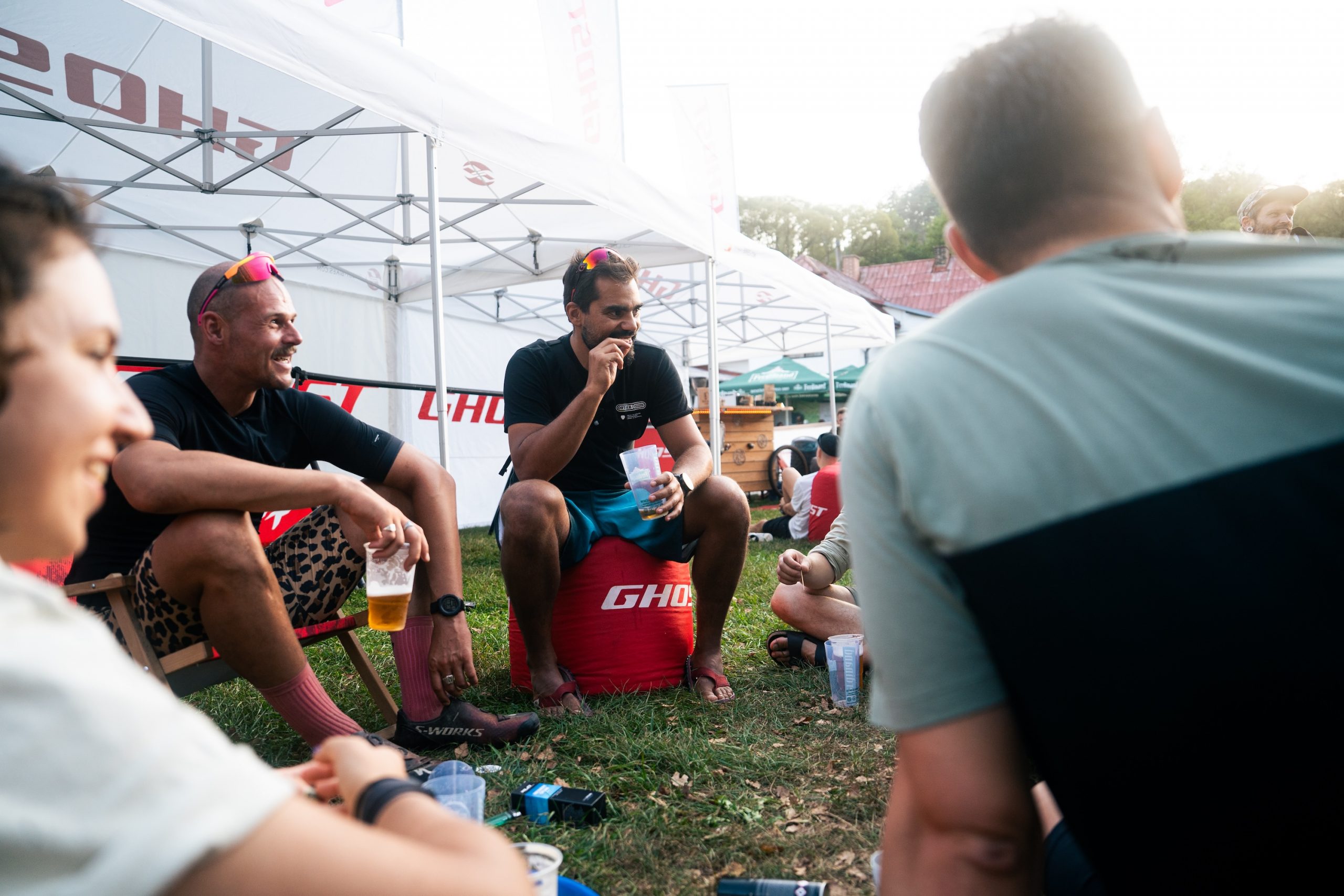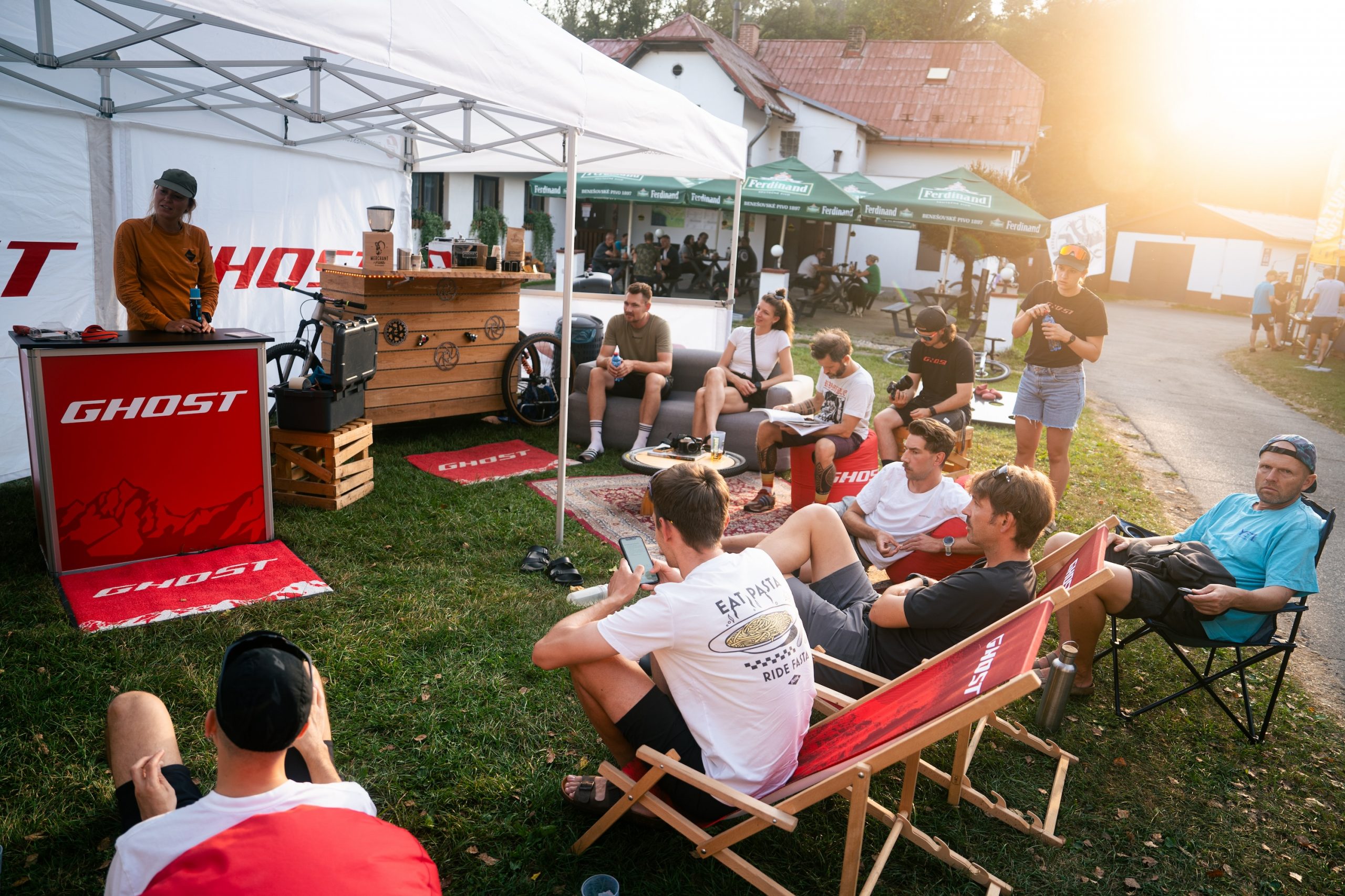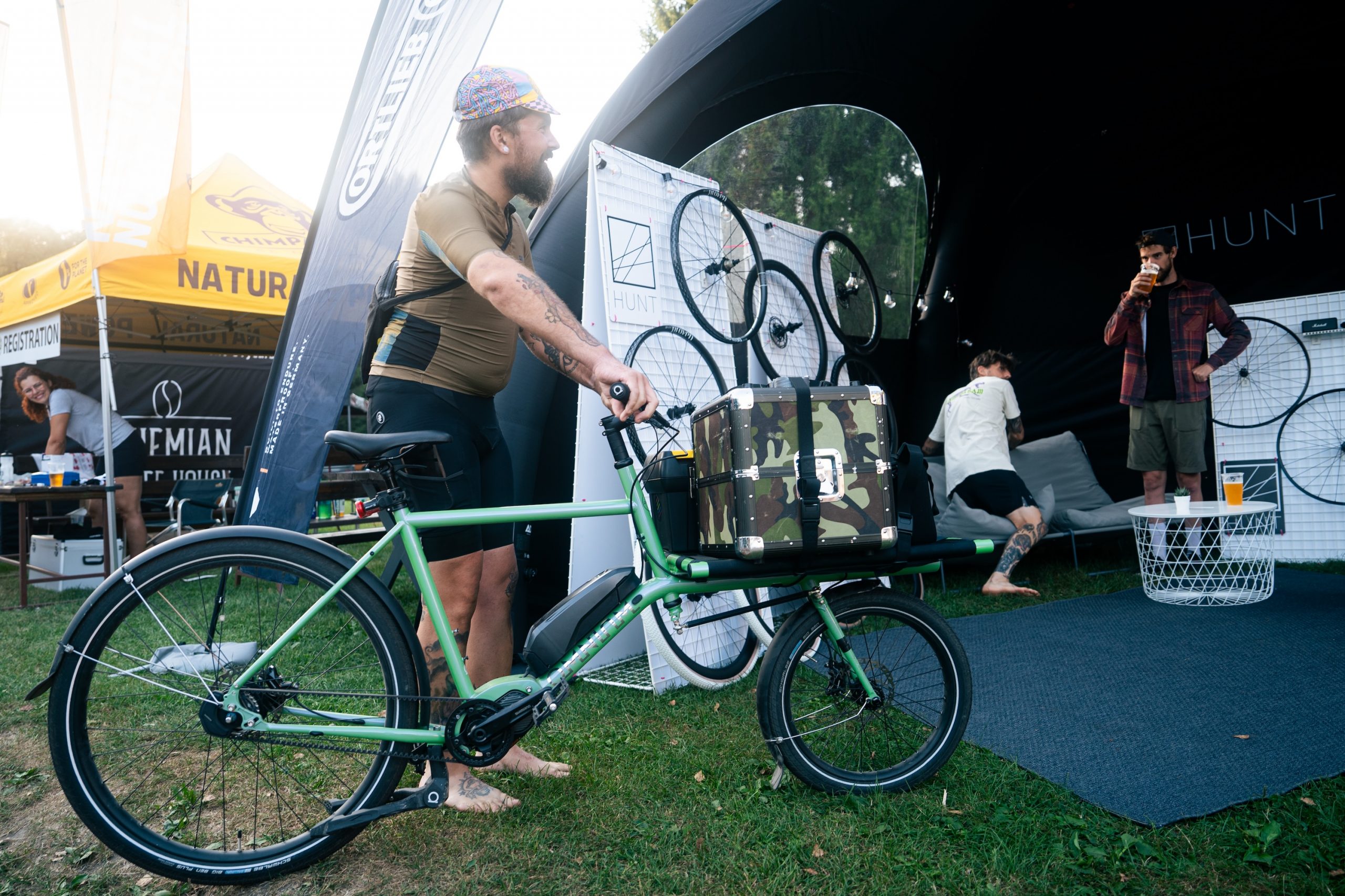 Later in the evening, DJ Feinkosttwang spun vinyl records to set a party atmosphere for those who still had energy, while the more tired participants could enjoy a cozy campfire. Many of us were dot-watching the participants of the Bohemian Border Bash Race, who were arriving at the finish in camp one by one in the late evening hours, cheered on by the campers. It was inspiring to see them arrive, having completed a grueling course of 1,400 km, with over 24,000 m of climbing within just one week. Congratulations to the race winners, Rasmus Bozyk and Betti Bögl, for completing the race in 126 and 162 hours, respectively.