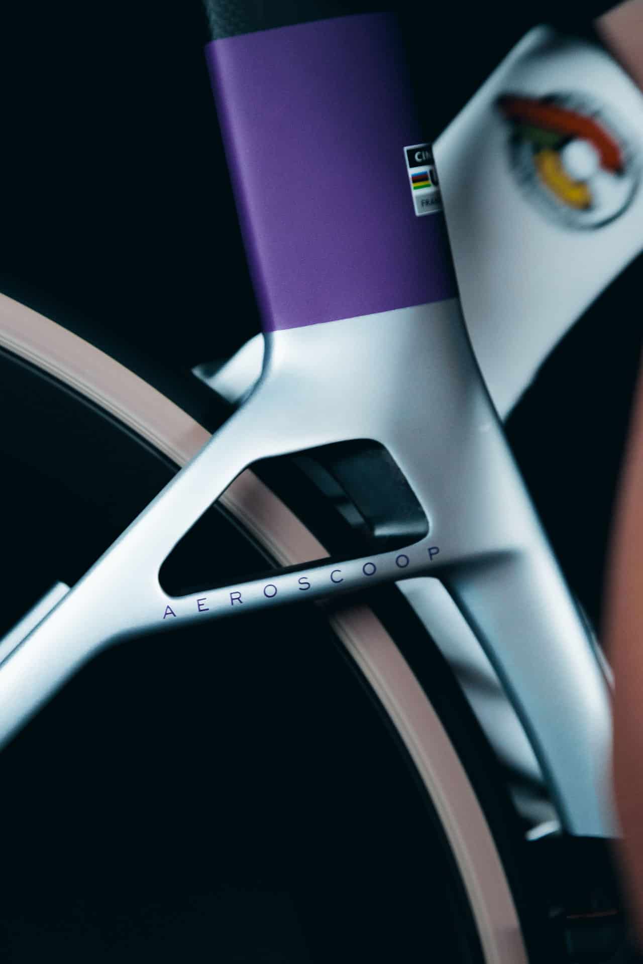 The Aeroscoop’s seat stays are its defining feature. They feature a central air channel at their junction with the seatpost, designed to reduce turbulence and guide airflow around the frame and rear wheel. It’s a design signature, a functional choice that incorporates the lessons learned from decades of working with Columbus steel and translates them into the language of carbon.