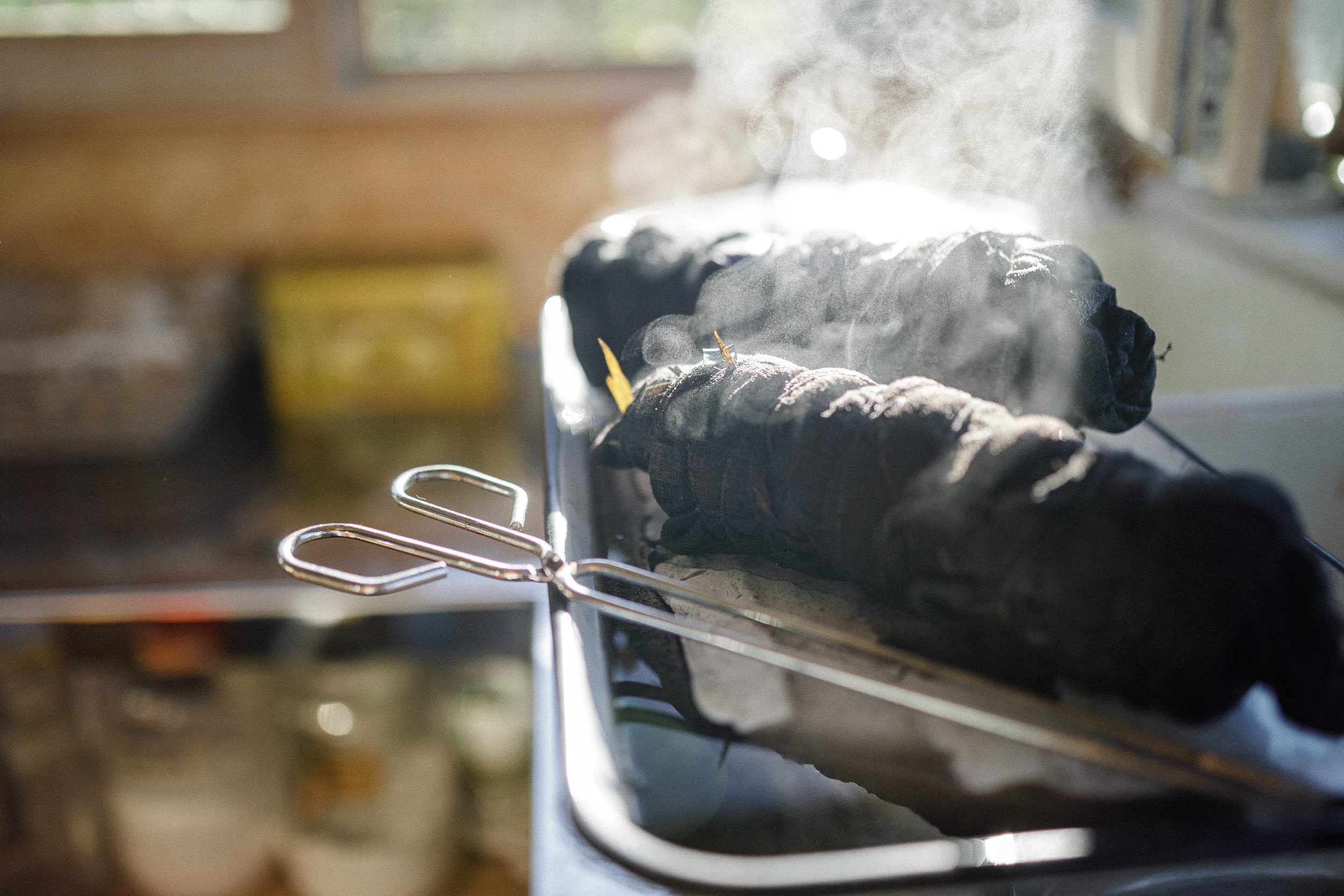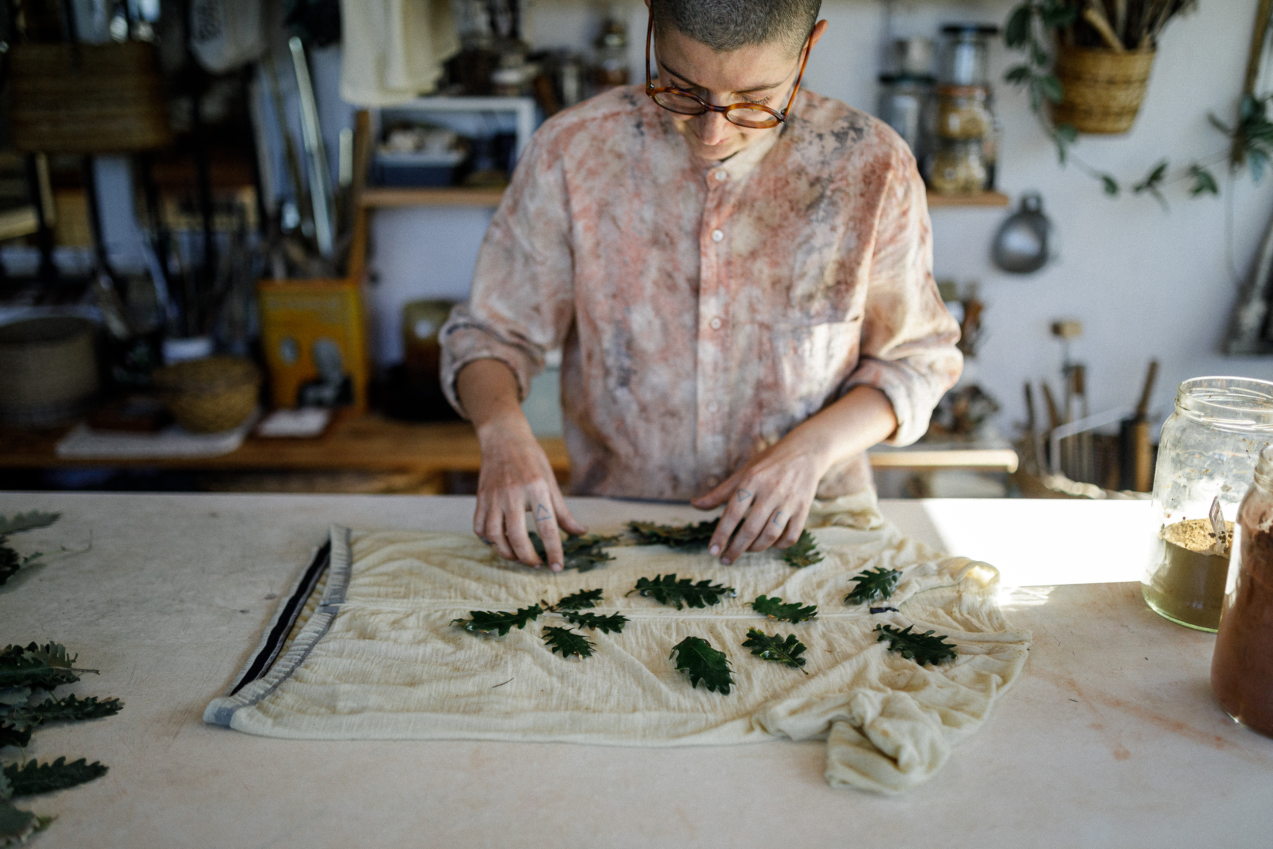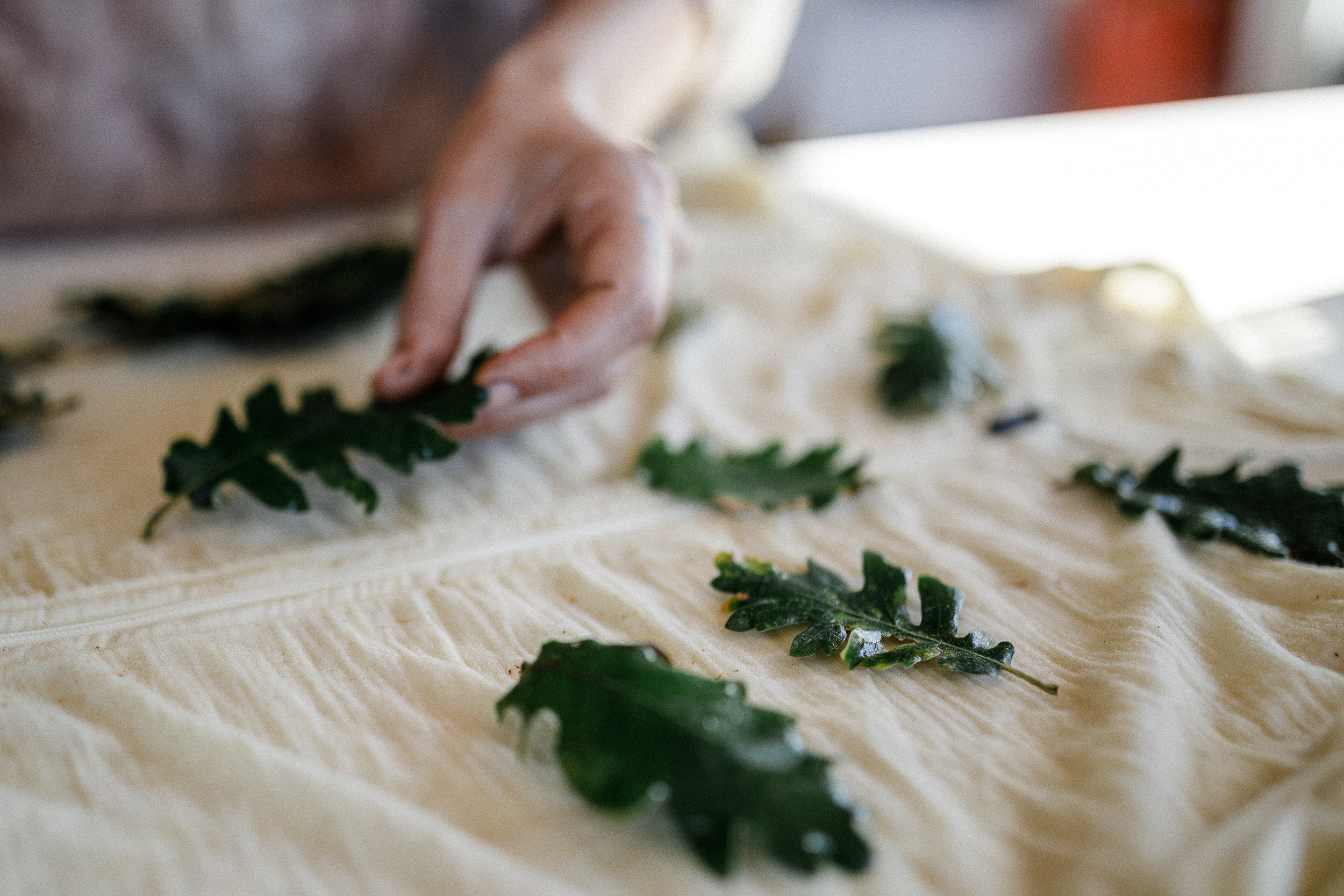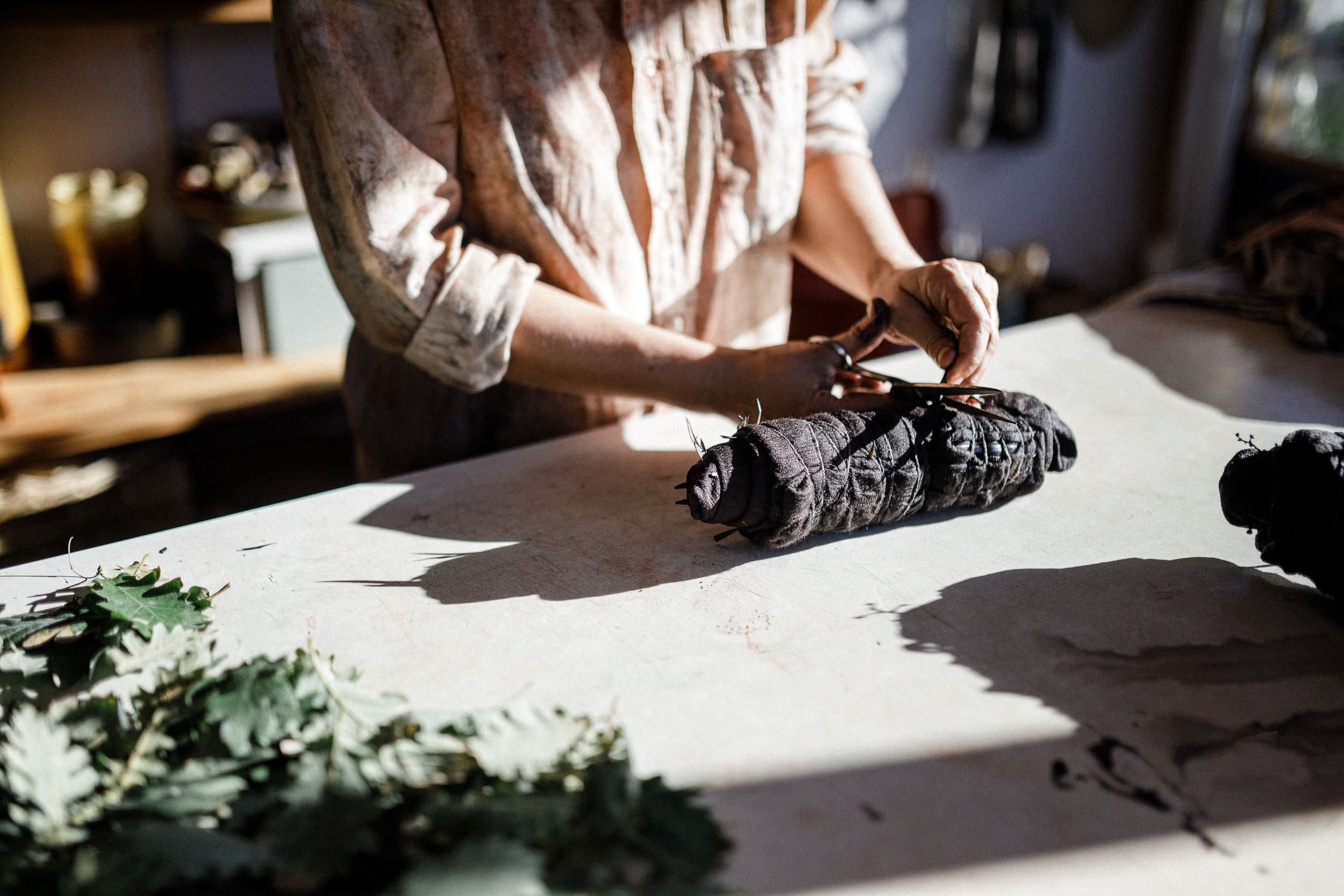 Franka opens the jersey and lays it down on the workshop table. She has several leaves and branches that she recollected earlier in the morning and precisely places them to achieve the desired eco print. The process might seem random but it is accurate and smart. The composition is finished, she makes a wrap, ties it like salami, and places it in a big pot with the dye. It looks like as we were cooking, the workshop suddenly smells sweet.