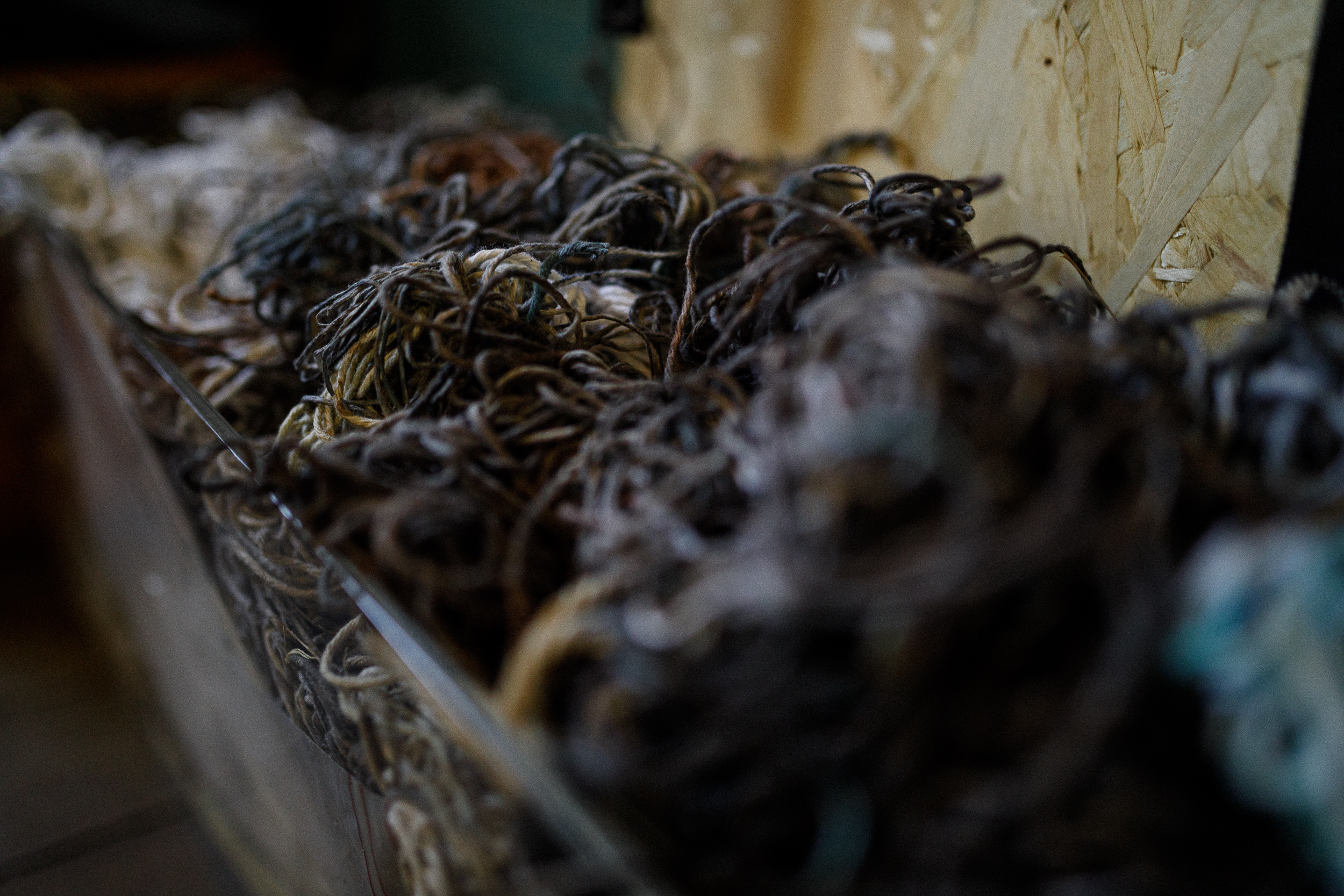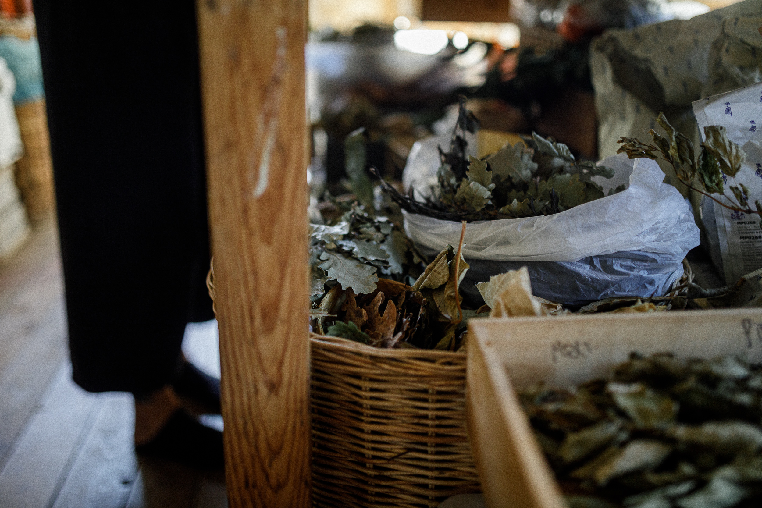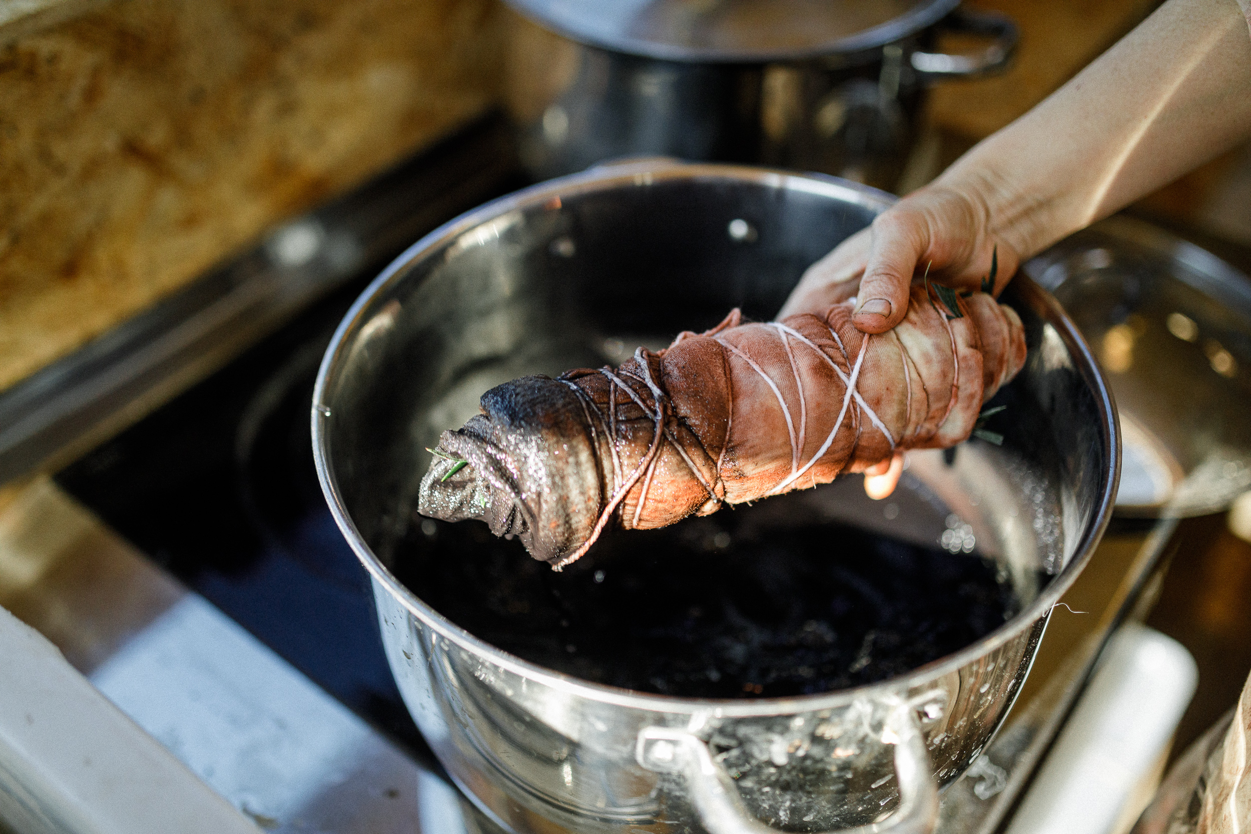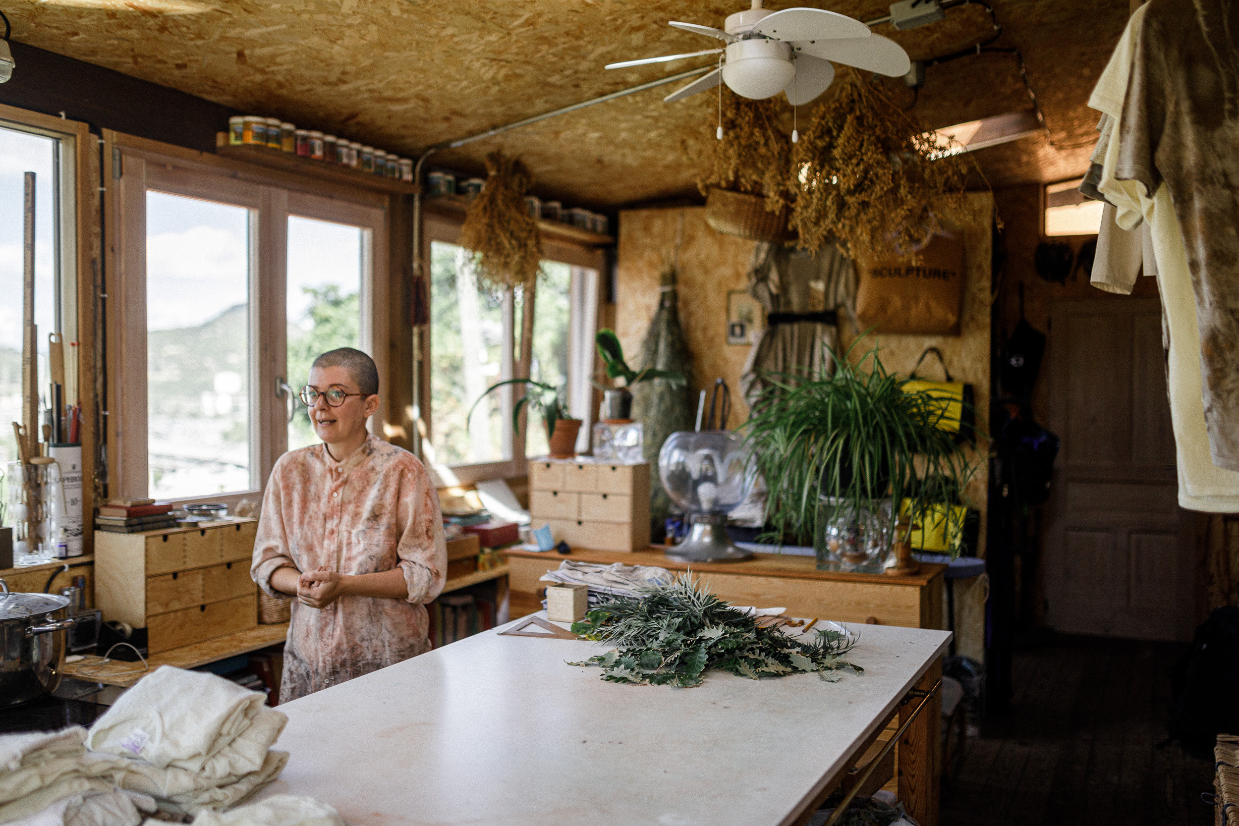 Franka opens the jersey and lays it down on the workshop table. She has several leaves and branches that she recollected earlier in the morning and precisely places them to achieve the desired eco print. The process might seem random but it is accurate and smart. The composition is finished, she makes a wrap, ties it like salami, and places it in a big pot with the dye. It looks like as we were cooking, the workshop suddenly smells sweet.