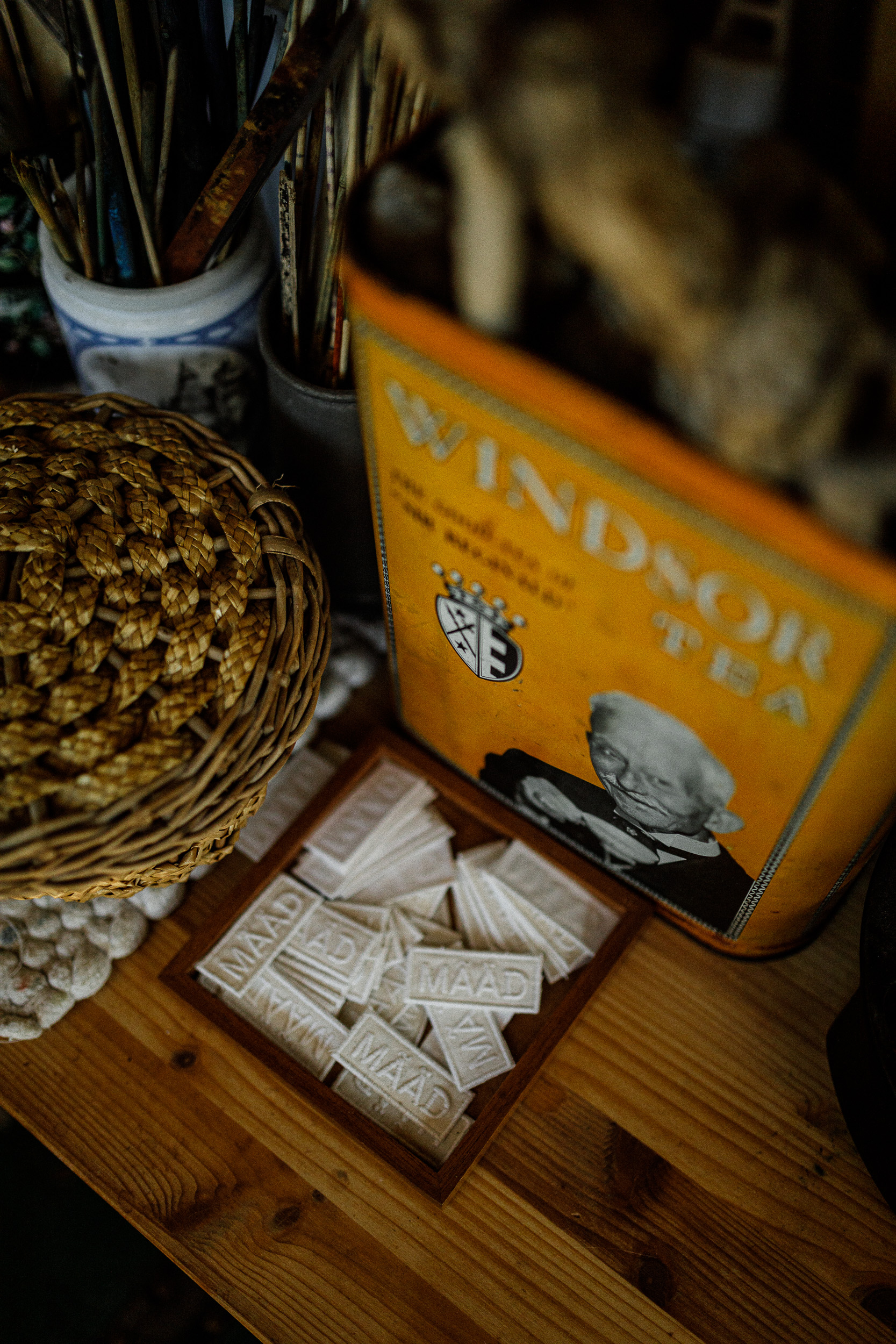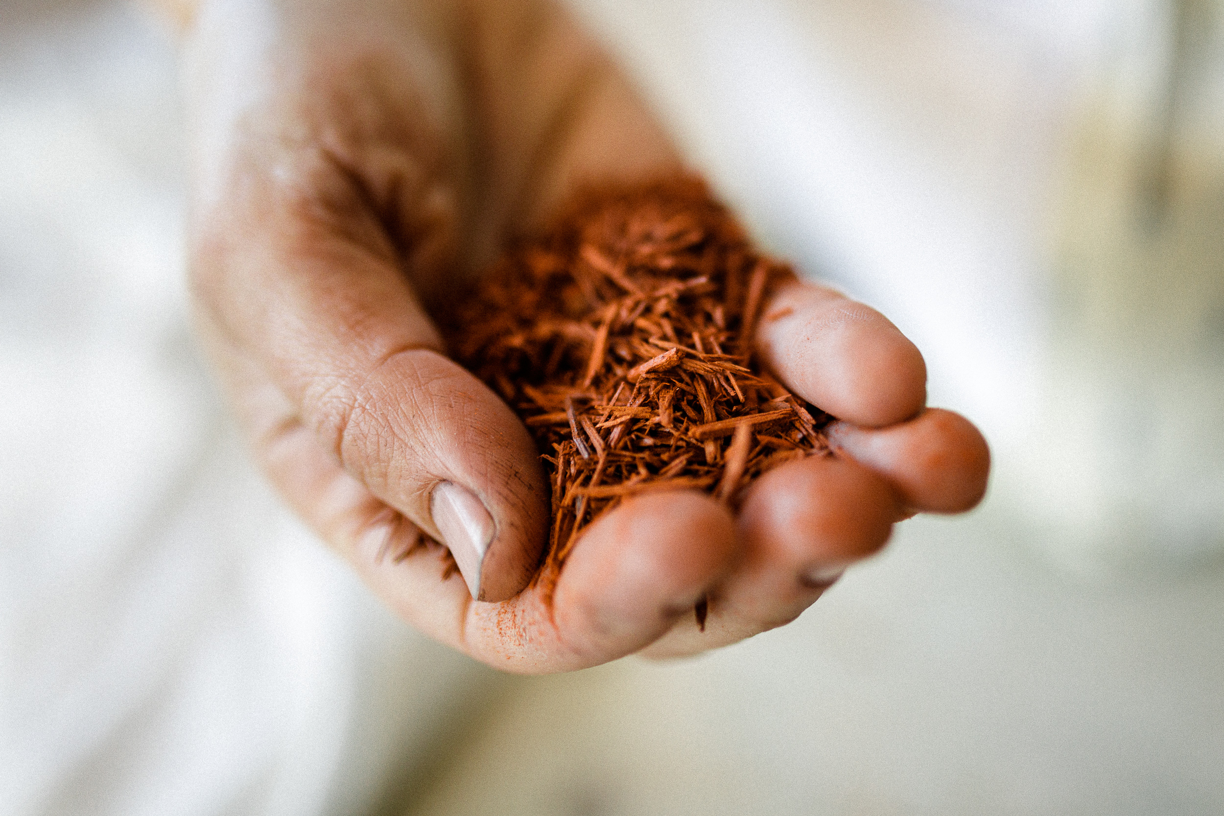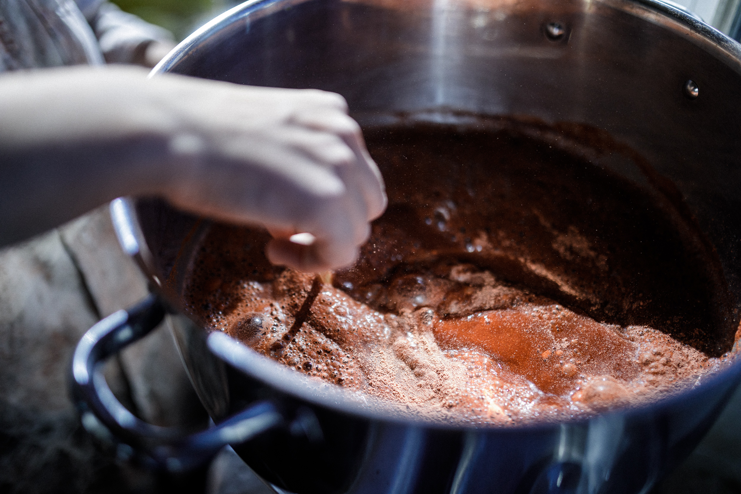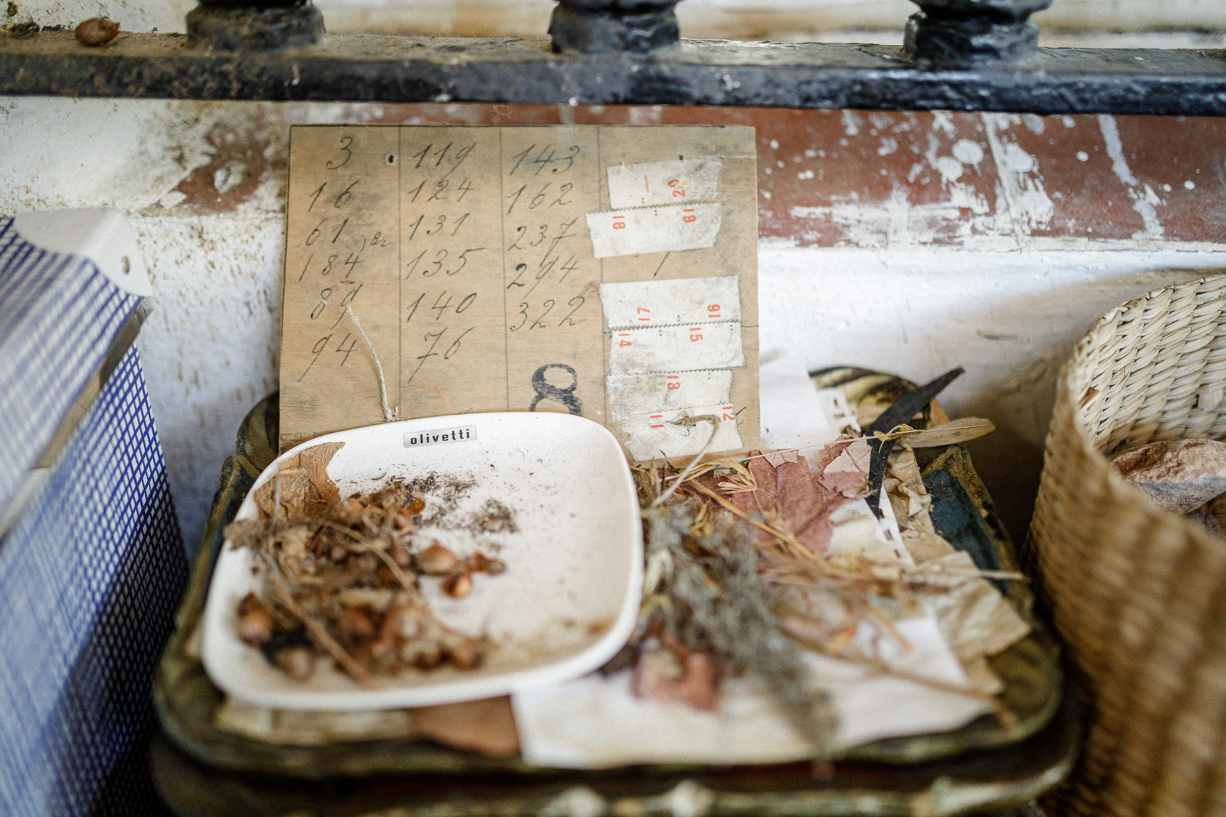 Franka opens the jersey and lays it down on the workshop table. She has several leaves and branches that she recollected earlier in the morning and precisely places them to achieve the desired eco print. The process might seem random but it is accurate and smart. The composition is finished, she makes a wrap, ties it like salami, and places it in a big pot with the dye. It looks like as we were cooking, the workshop suddenly smells sweet.
