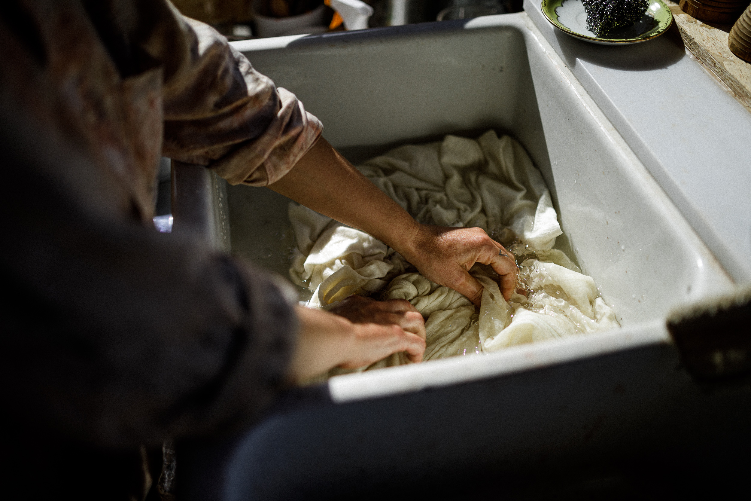 Since we could see firsthand the dyeing process, we understood the subtleness of the method and Franka’s dedication to creating every single piece. Everything starts in a family workshop in Poblenou, where the jersey patterns are cut and later taken to Santa Coloma de Gramenet for sewing. After that, the garment is washed, dried, and from that moment on the magic starts.