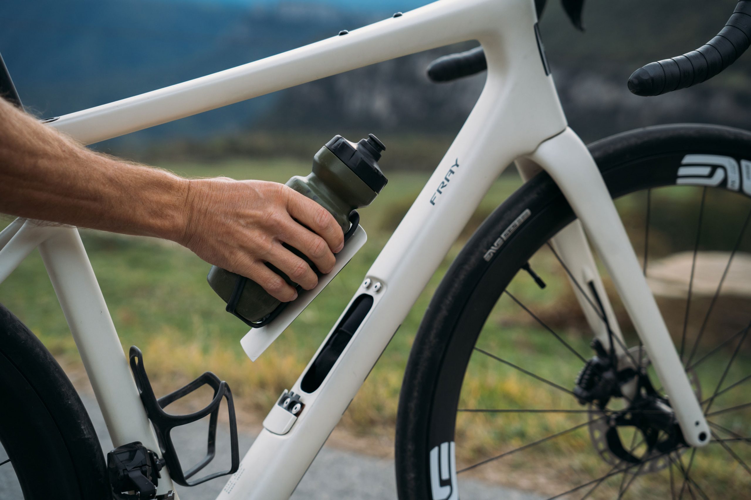 If you look at the downtube you will spot the ENVE Cargo Bay, an in-frame storage solution that can be configured to carry tools and extra clothing. Each Fray comes with two cargo bags constructed of neoprene which serve to protect your stuff while preventing unwanted rattling in the downtube. This system is attached to the tube with four points of contact, and a Teflon layer inhibits the potential consequences of dripping liquids over it. Following on the features intended to address the inherent needs of long rides, you can also find mounts on the top tube and below the down tube.