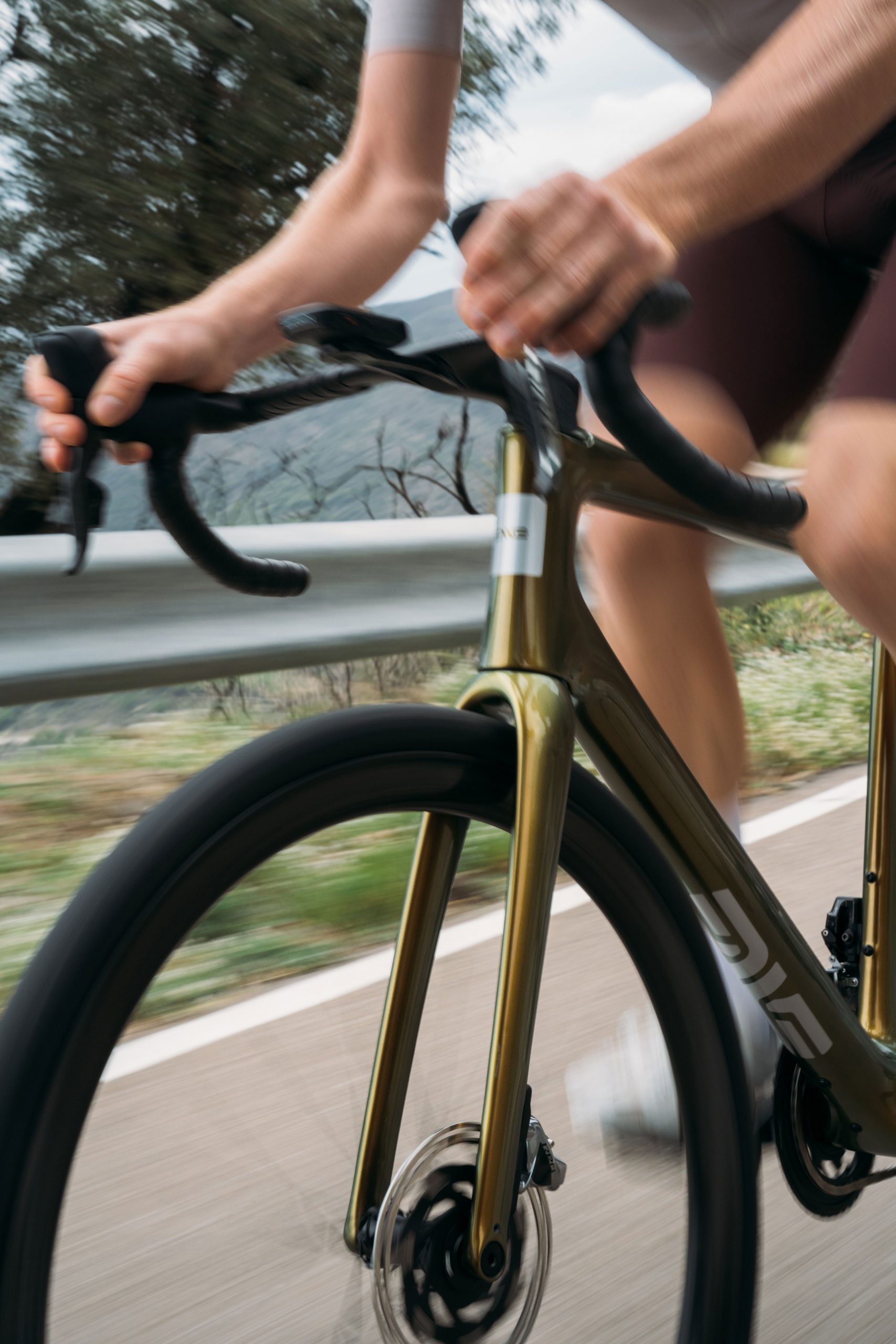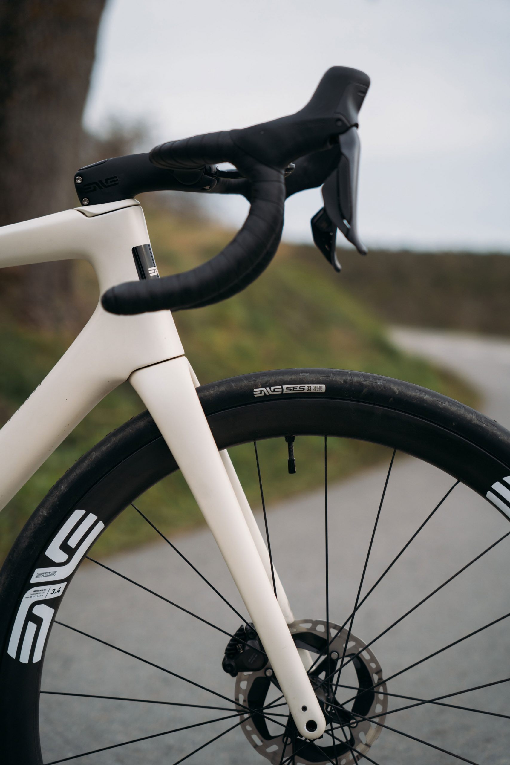 This bike is optimized for 31-35 mm tires, with clearance up to 40 mm if equipped with a x1 chainring. The new ENVE SES tires are the optimal choice for any Fray build. We tested an x2 SRAM build with the recently launched 35 mm SES Road Tire with a pressure of 2,7 bars, which allowed us to surf over the cobbles of the Carrefour de l’Arbre. We thought it would negatively impact the speed and overall performance of the bike on paved sections, but it rolled very fast and the stability was great even when facing varied gusts of wind.