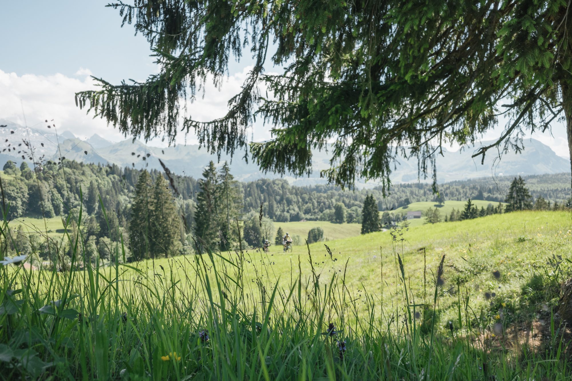 El área de Muotathal es un impresionante valle verde lleno de senderos a través de bosques y cascadas, donde el placer de montar en bici por las praderas compensa el dolor en las piernas causado por el desnivel acumulado.