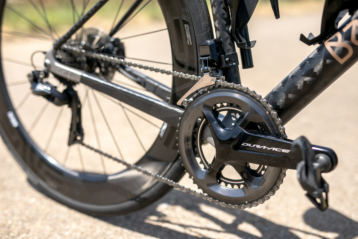 El conjunto de la bicicleta está formado por componentes premium de distintas marcas. En cuanto al cockpit, estaba formado por un combo de manillar y potencia Fizik Cyrano, siguiendo por un sillín Fabric Scoop, un juego de ruedas ENVE SES 7.8 disc con neumáticos Continental de 28mm y un grupo completo Shimano Dura-Ace 9150 Di2.