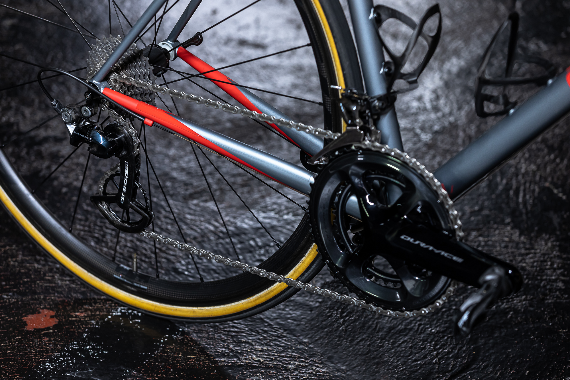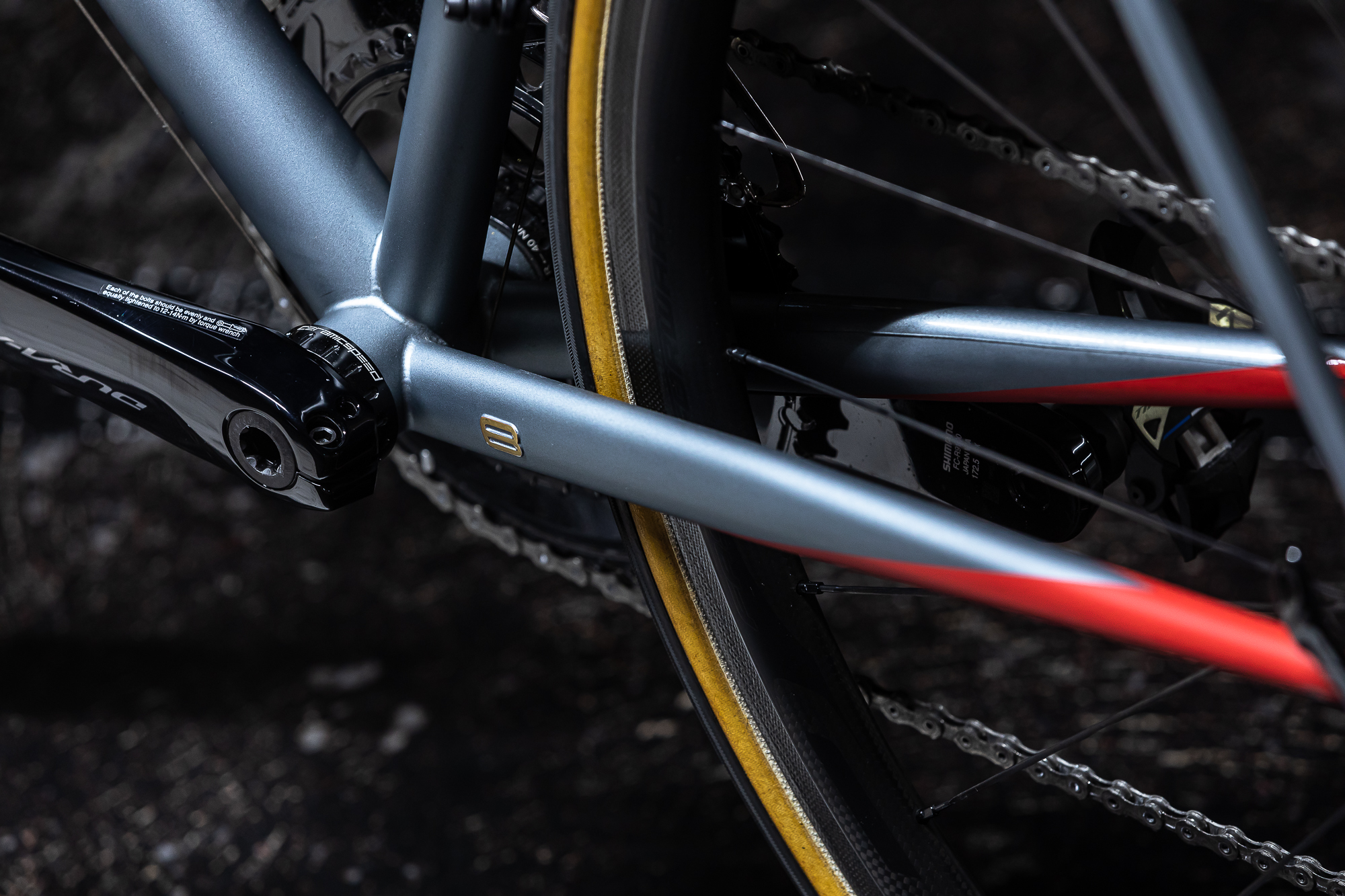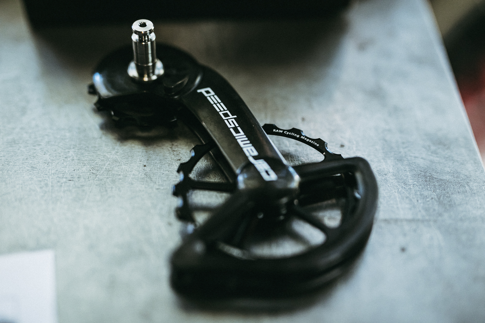 En cuanto a los componentes, hicimos una selección cuidada y sin concesiones, priorizando la ligereza y las prestaciones que pudieran aportar a la bici. Teníamos claro que el grupo que montaríamos para la transmisión sería Shimano Dura-Ace 9100 mecánico, vitaminado con un kit completo de Ceramic Speed formado por eje de pedalier, cadena con tratamiento especial anti fricción y patilla del cambio con sus características roldanas sobredimensionadas y personalizadas para la ocasión (véase RAW Cycling Magazine grabado en una de las roldanas). ¿Porque no electrónico?, las versiones mecánicas de los grupos permanecen imbatibles en cuanto a peso, una de las prioridades del montaje.