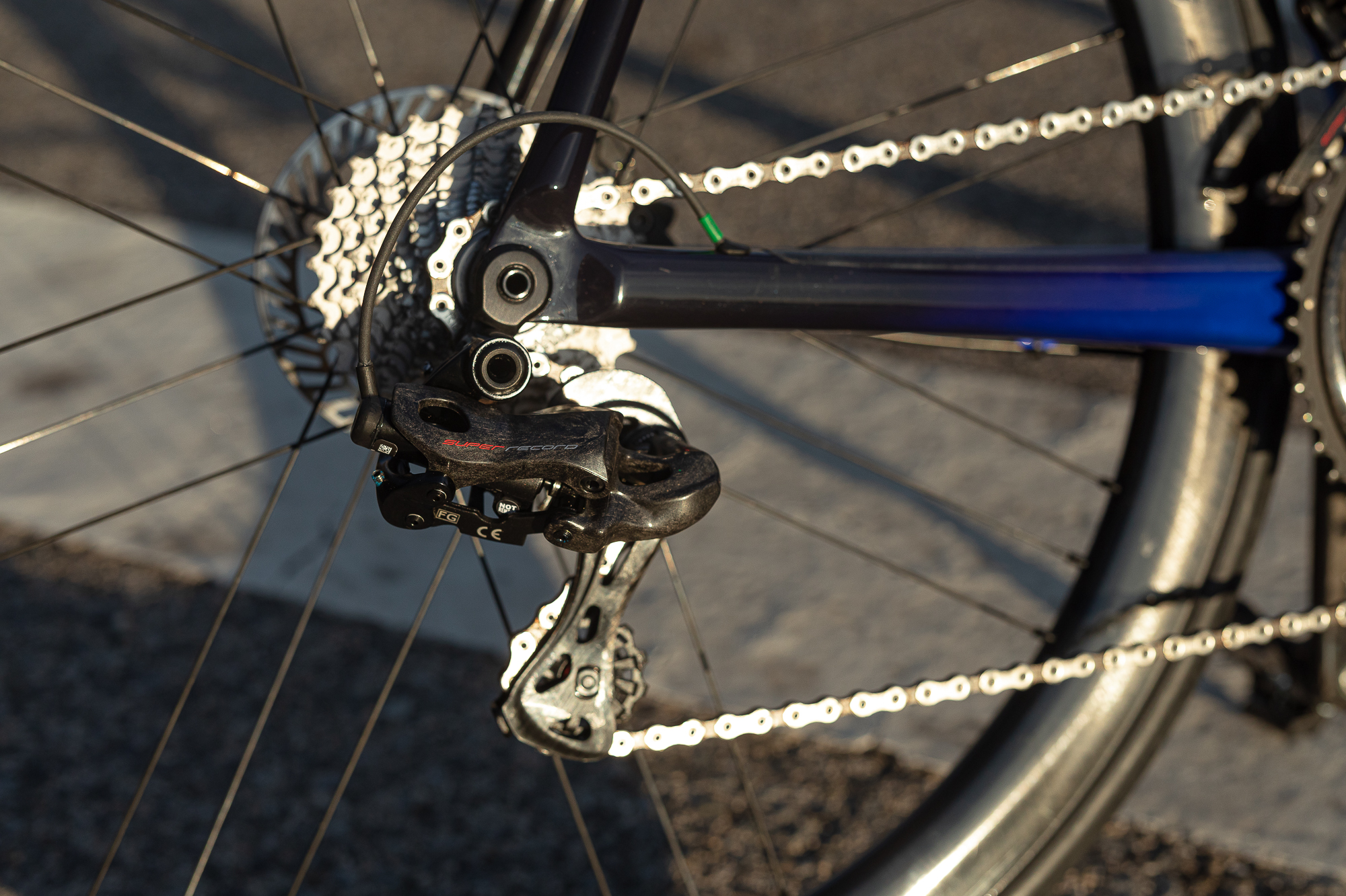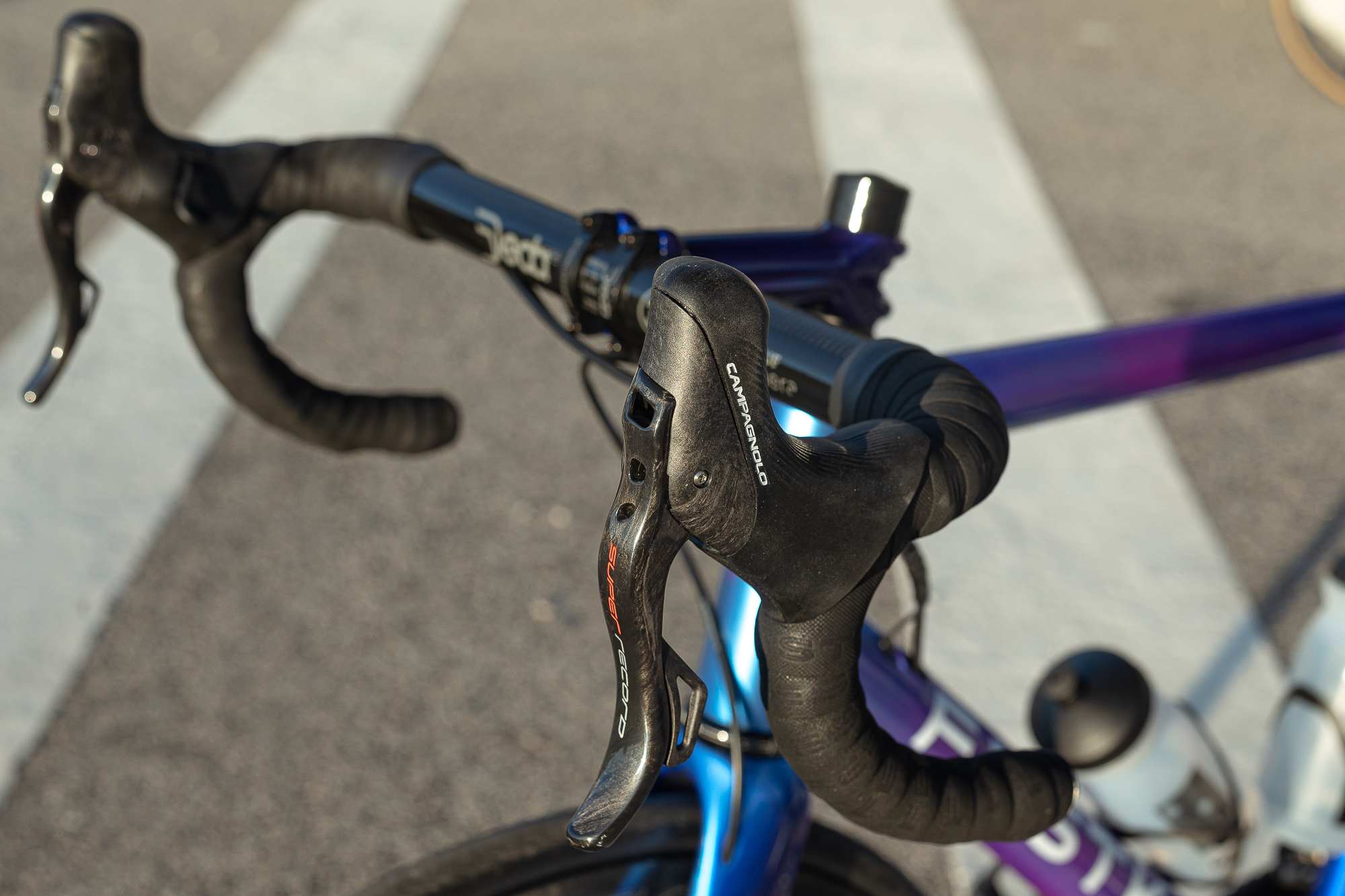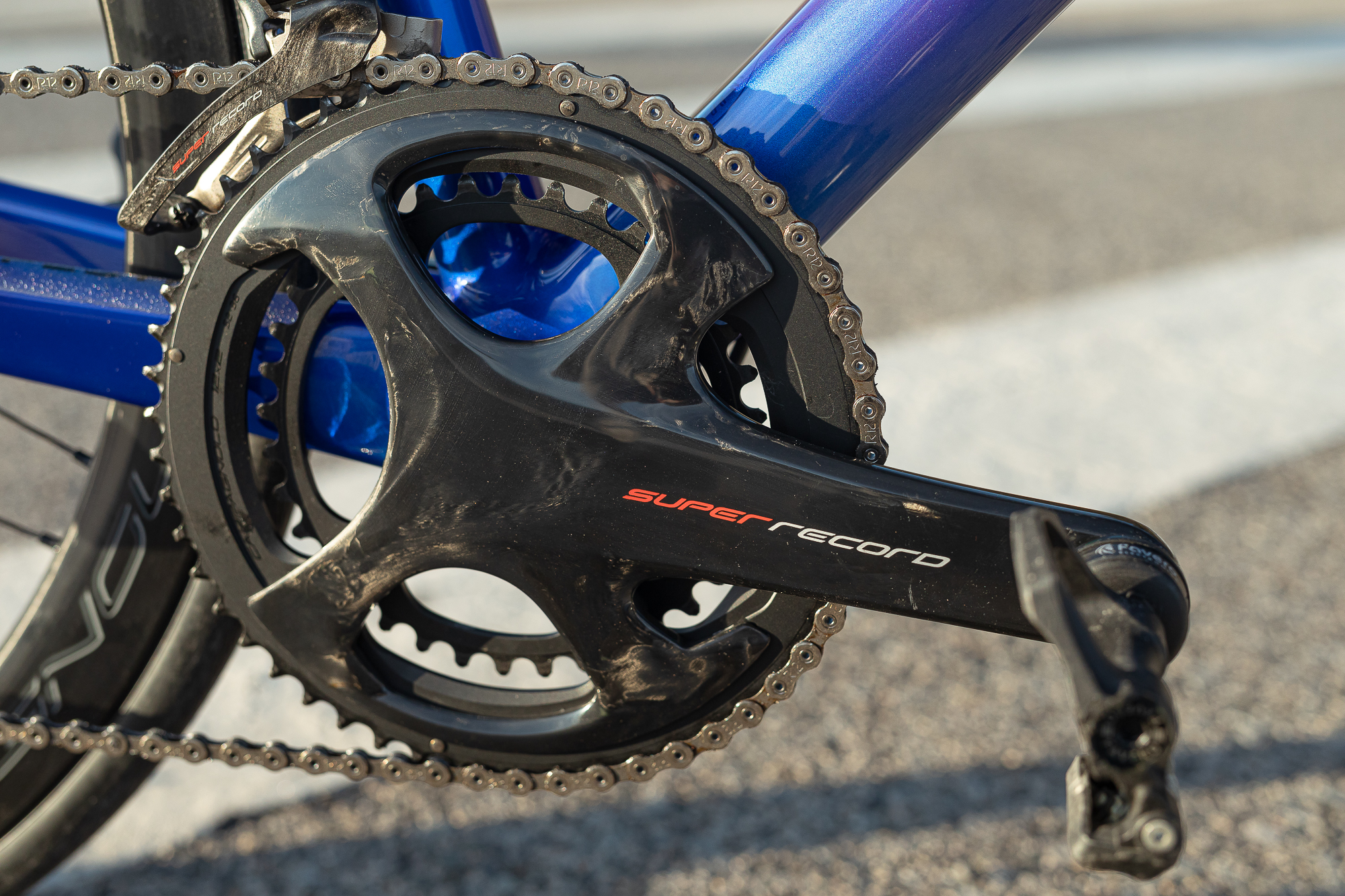 Explicadas ya las bondades del cuadro, podemos hablar de un conjunto TOP. El funcionamiento del Campagnolo Super Record EPS 12, a pesar de sus enormes manetas, es MUY preciso y rápido. Las ruedas también de la firma italiana, con un marcado perfil Aero, están a la altura del conjunto, el tacto de los frenos hidráulicos de Campagnolo, muy predictivo y progresivo, también conjuntan con la sensación de control que ofrece el cuadro.