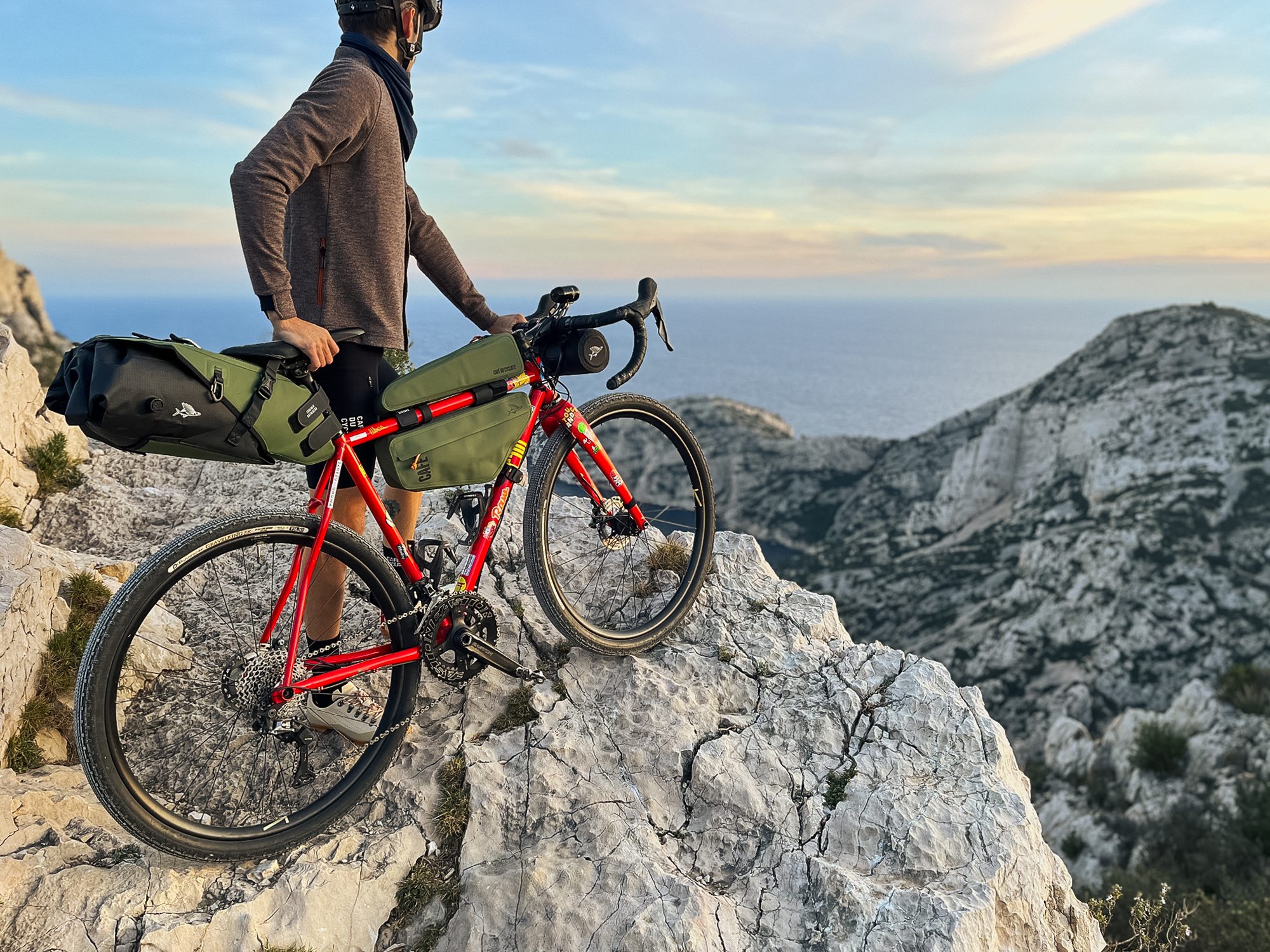 Recientemente pudimos probar algunos de sus productos de la colección Audax y Outlands, compuesta por culottes con bolsillos laterales, chaquetas para el frío, cómodas camisetas interiores y algunos maillots. Todos ellos nos encajaron perfectamente y se adaptaron a las cambiantes condiciones climáticas, con el toque especial distintivo de Café du Cycliste que nos hará destacar del resto. Pese a ello, nos gustaría destacar y profundizar en sus bolsas para bicicleta y zapatillas gravel.