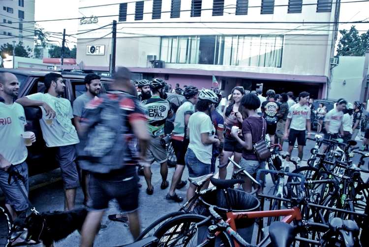 Con nuestras bicis al hombro bajamos las escaleras, y entre los más de 80 participantes salimos de la tienda Ciclo-Canibal, yo simplemente la seguía sin saber a dónde nos dirigíamos. Llegamos a la Central High School, localizada en la Avenida Ponce de León, una de las avenidas principales de la capital, subimos las escalinatas y nos colocamos al final de las escaleras, donde los participantes solo alcanzarían a vernos gracias a las luces de nuestros velocípedos (esas fueron las instrucciones).