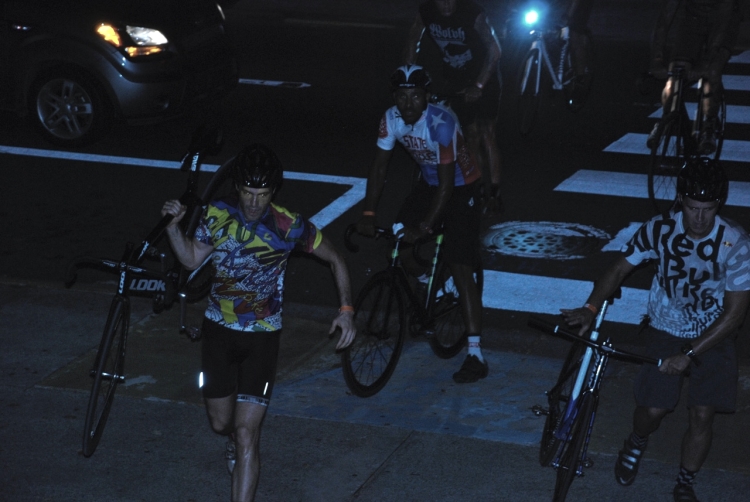 ¡Comienza el Alleycat! Tomó un poco más de diez minutos hasta que comenzaron a llegar los ciclistas, por grupos, en manadas, algunos casos en pareja y en casos más aislados, alguno en solitario. Por razones obvias, los extranjeros siempre pegados a la rueda de algún ciclista local y como no, allí estaba con sus dos cámaras el Sr. Lucas Brunelle.