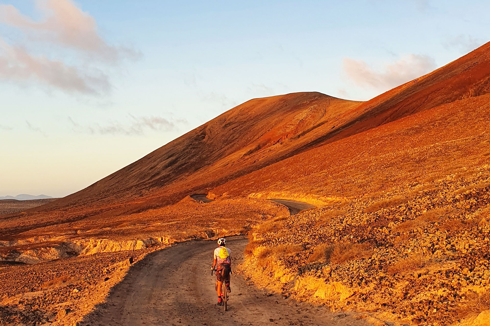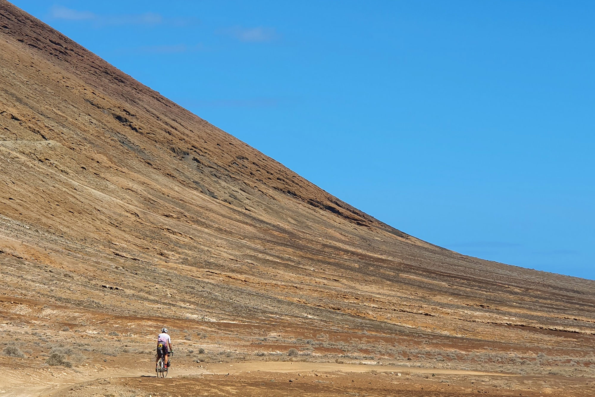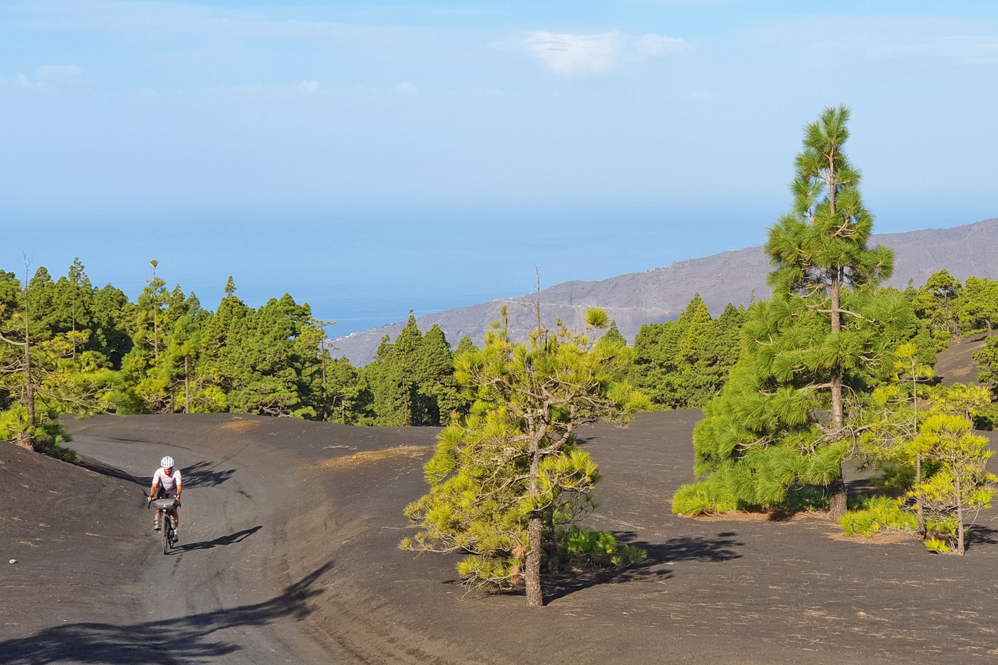 Si nos centramos en la ruta en gravel, por ejemplo, esta empezará desde la terminal de ferries en La Graciosa, donde se hará una ruta circular. Luego saltaremos a Lanzarote y la cruzaremos de un extremo atravesando sus paisajes negros volcánicos. Lo siguiente serán los desiertos de Fuerteventura con dunas que nos trasladarán al Sáhara. Una vez en Gran Canaria tendremos que subir por bosques hasta el Pico de las Nieves a 1.949 m sobre el nivel del mar para bajar de nuevo y montarnos al ferry hasta Tenerife, donde no pararemos de subir hasta ver el Teide. Finalmente, último ferry hasta El Hierro y su paisaje escarpado. El recorrido es 70% sin asfaltar con un terreno compacto y rodador, quitando el desnivel.