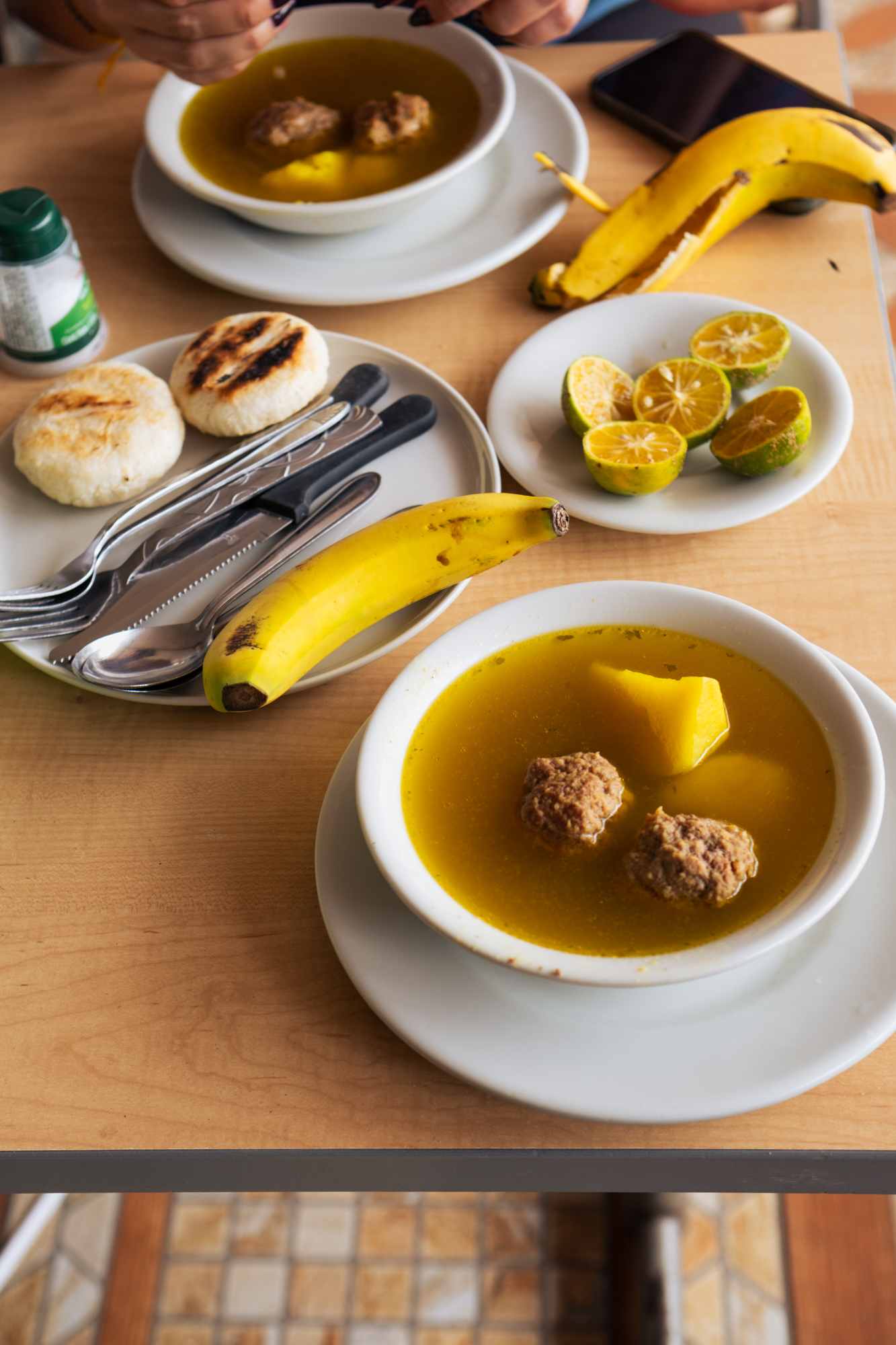 Dedicamos toda la mañana a ello, por lo que el tiempo se nos echó encima. Era una etapa de transición, rodeando Pereira para luego adentrarnos en el departamento de Quindío. Según los locales, la comida más típica en Colombia antes de salir a rodar es un buen caldo, por lo que seguimos sus consejos y lo complementamos además con una refrescante agua panela fría con limón.