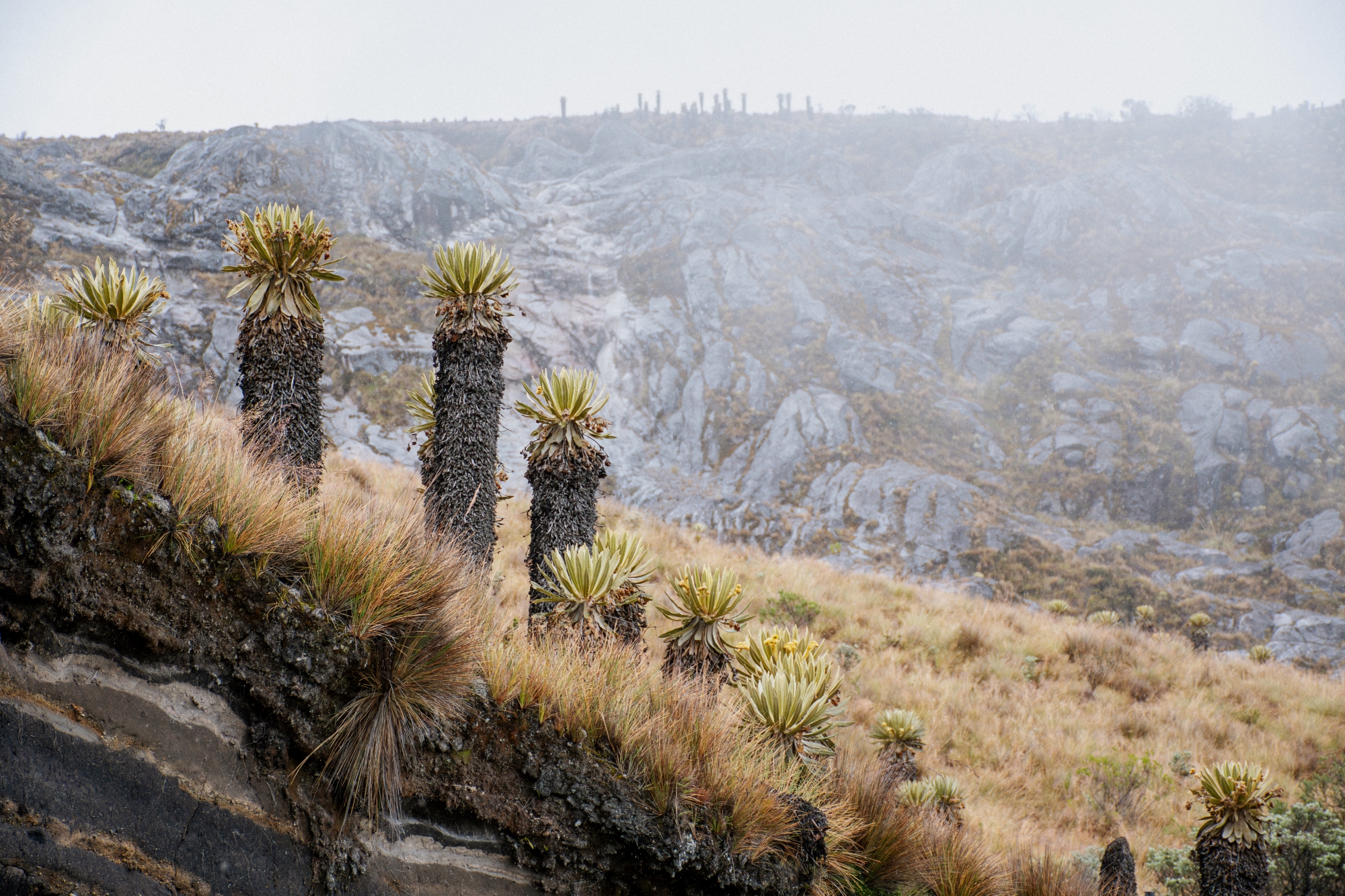Sobre la cota de 3.800 la fauna desapareció, y el paisaje parecía de otro planeta. Es lo que se conoce como el páramo. En ese momento avistamos los primeros frailejones, una planta nativa con un grueso tronco y una roseta en la parte superior. Nos dijeron que apenas crecen 1 cm por año, por lo que al apreciar el tamaño de algunos de ellos imaginamos lo antiguos que son.