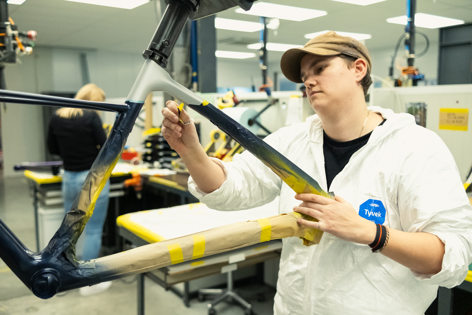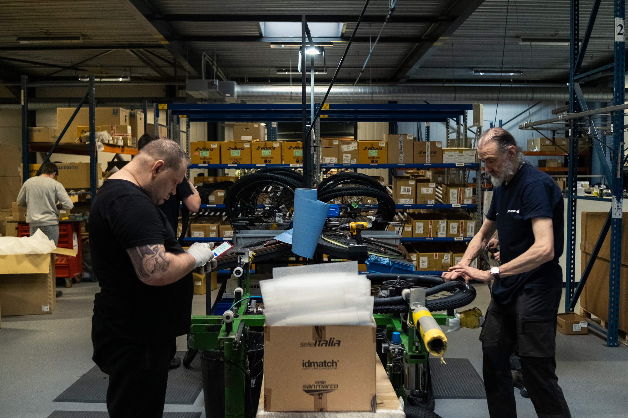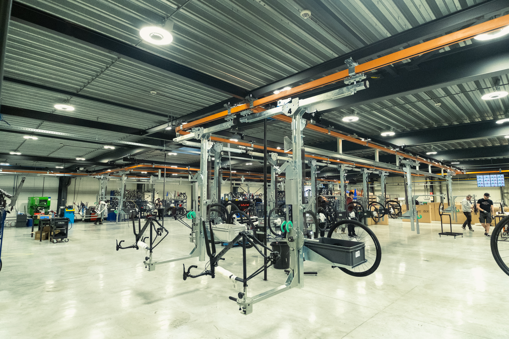 El montaje de bicicletas se divide en dos líneas paralelas. Antes un operario montaba una unidad completa, pero ahora existe una línea de montaje móvil en la que los operarios se especializan en una única tarea que ejecutan una y otra vez. Aun así, para alguien centrado en la parte del desviador, no es lo mismo construir una cambio electrónico que un grupo manual.