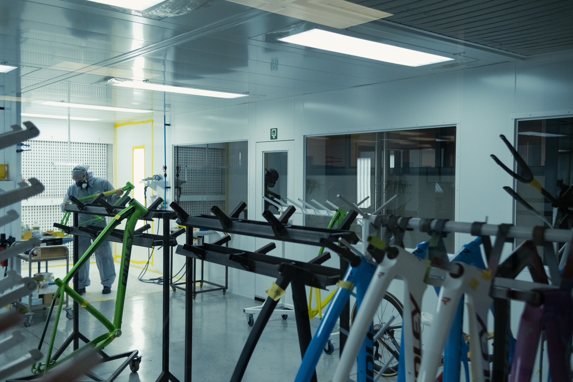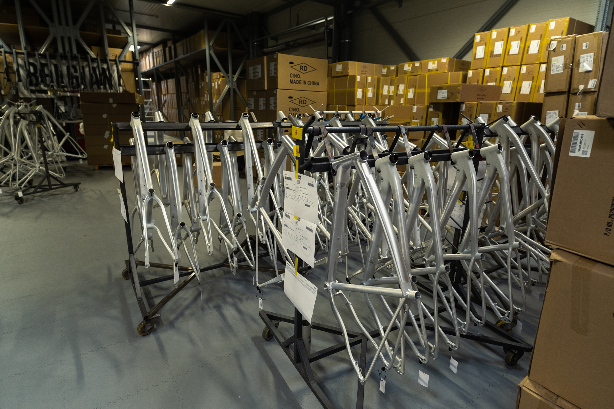 Tras pasar por el almacén, donde vimos bicis completas listas para ser enviadas a países tan dispares como Suecia, Polonia o Nueva Zelanda, nos explicaron todo el proceso de pintado. La mitad de los cuadros están pintados en Bélgica, mientras que la otra mitad en Moldavia.