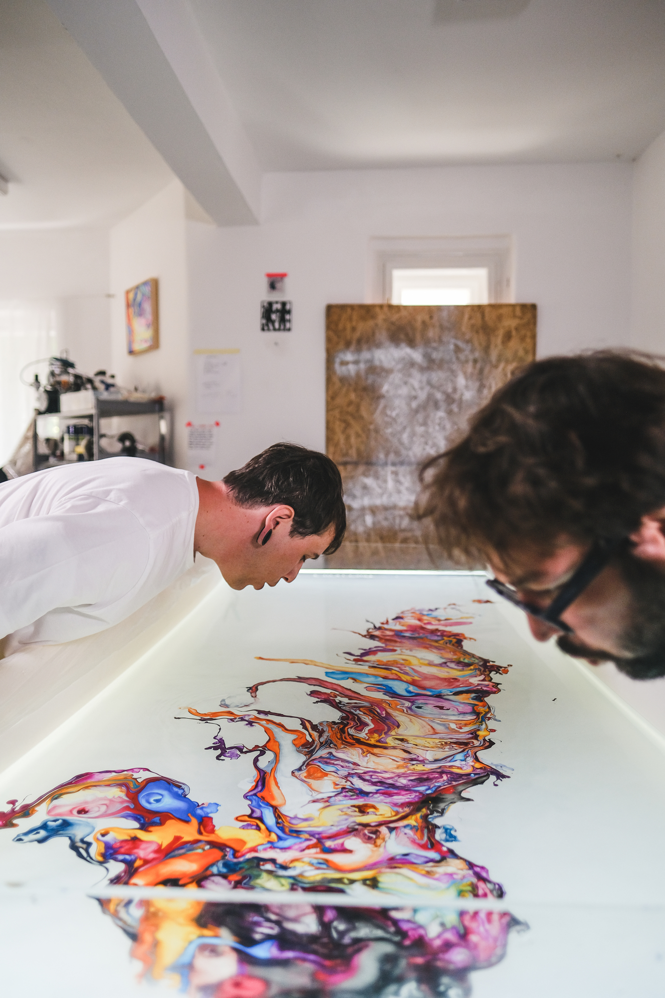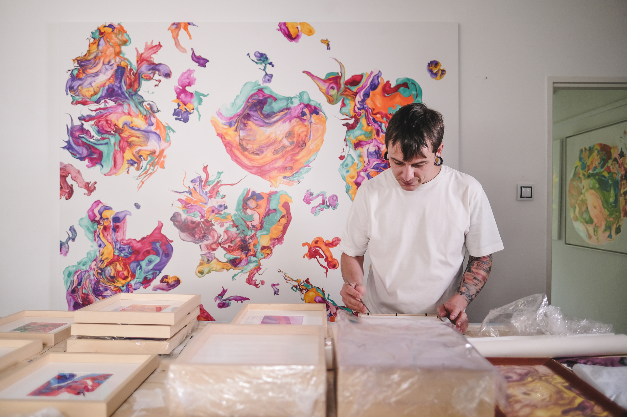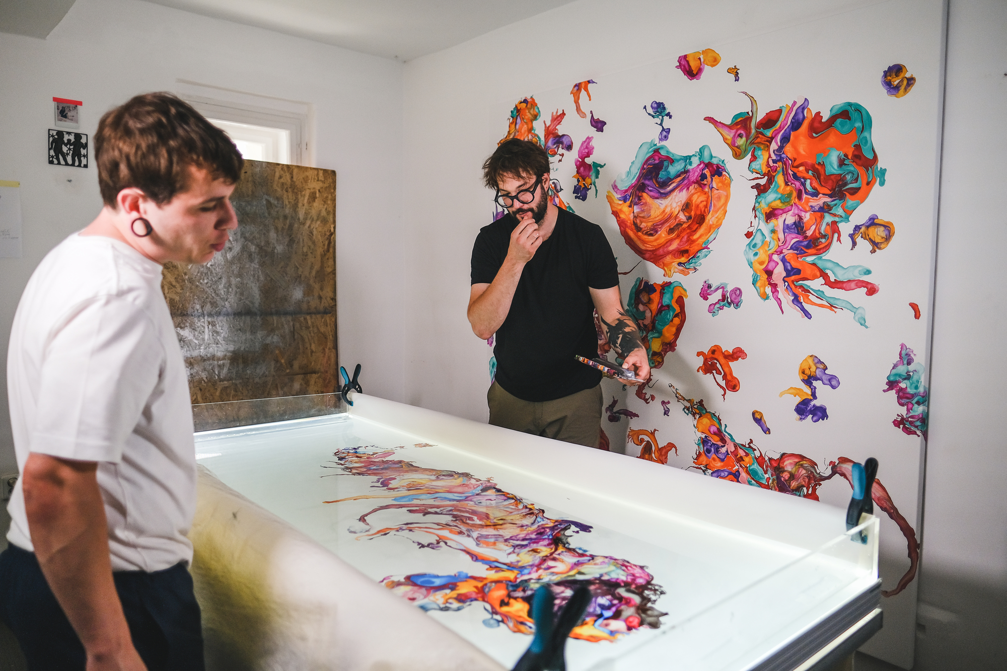 “We’d been attracted to product design for some time and when the guys from Festka asked us if we’d like to try something with their frames, we were both totally up for it. We don’t paint directly on canvas or a 3D object. We paint on the surface of water held in a shallow tank. We pour paint on the surface using self-made tools which we call paddles. They are specially designed to keep the individual colors in parallel stripes which we blow and manipulate into the desired shapes. The canvas or the 3D object we’re painting sits at the bottom of the tank. The transfer happens by releasing the water from the tank very slowly,” say the artists.