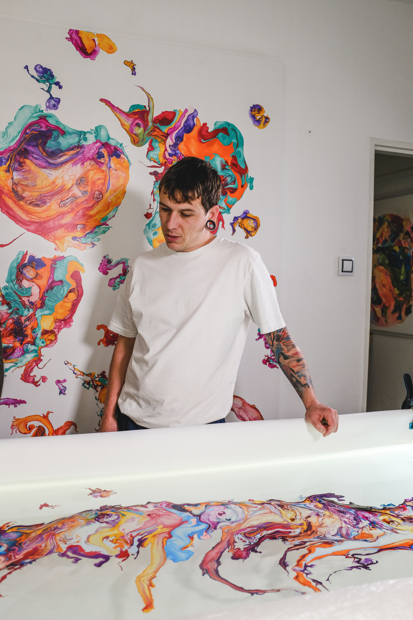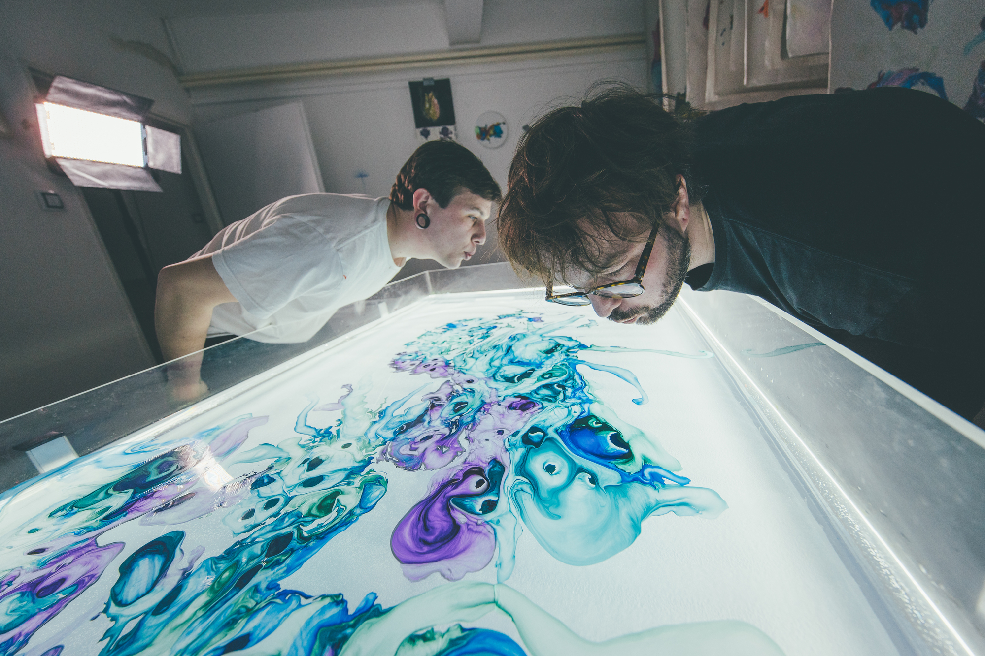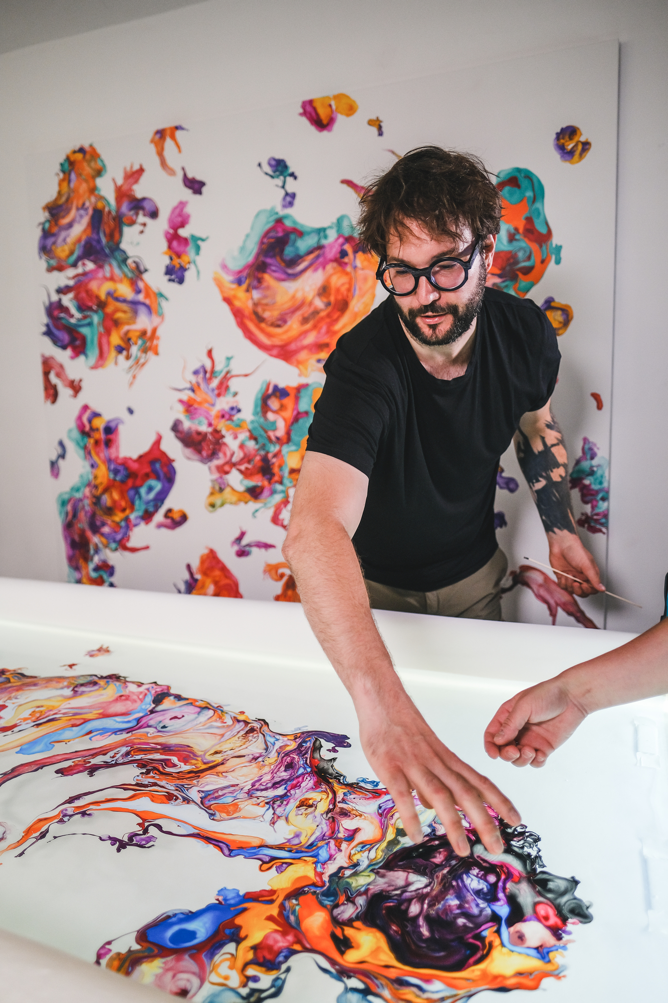 “We’d been attracted to product design for some time and when the guys from Festka asked us if we’d like to try something with their frames, we were both totally up for it. We don’t paint directly on canvas or a 3D object. We paint on the surface of water held in a shallow tank. We pour paint on the surface using self-made tools which we call paddles. They are specially designed to keep the individual colors in parallel stripes which we blow and manipulate into the desired shapes. The canvas or the 3D object we’re painting sits at the bottom of the tank. The transfer happens by releasing the water from the tank very slowly,” say the artists.