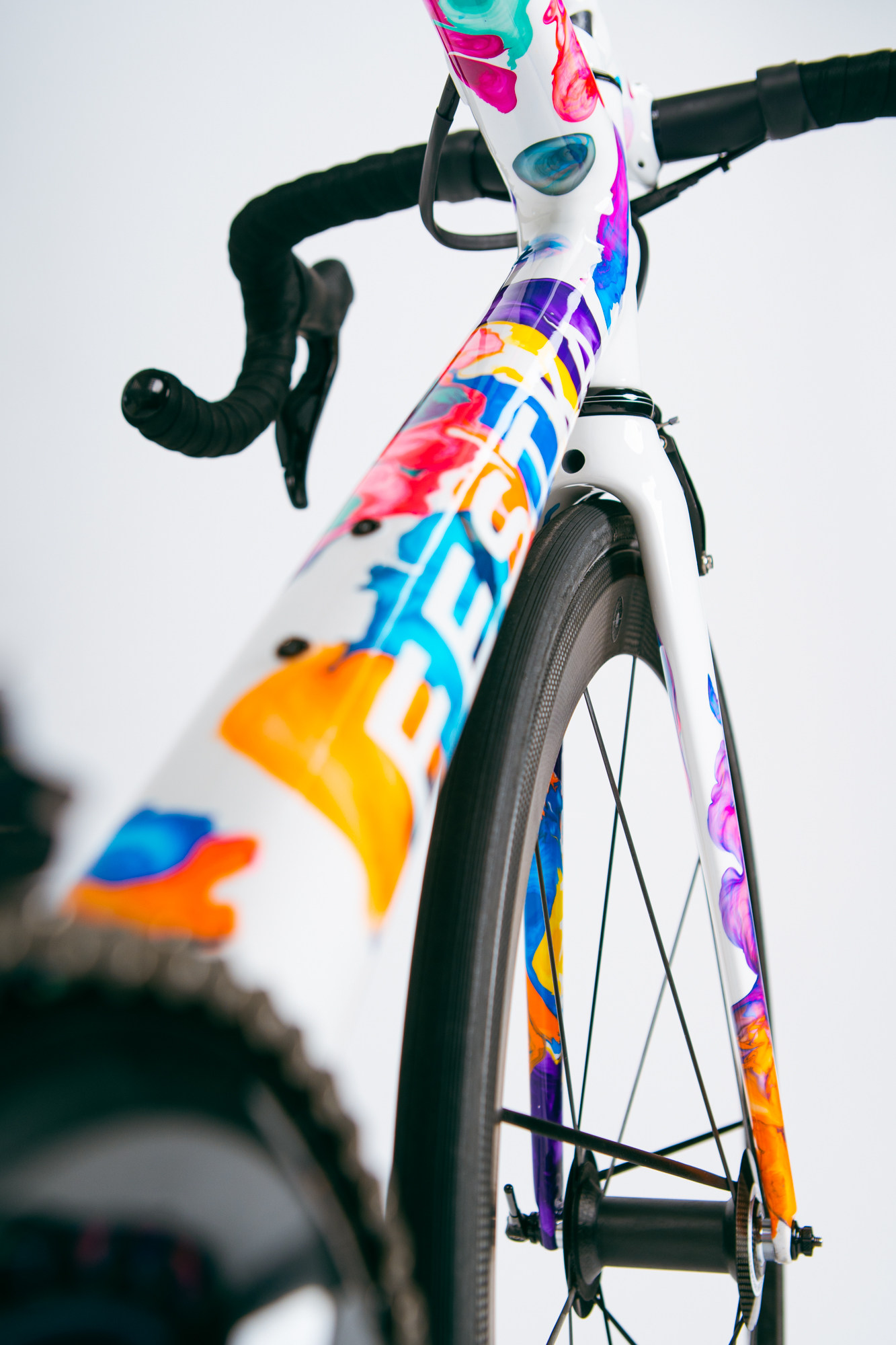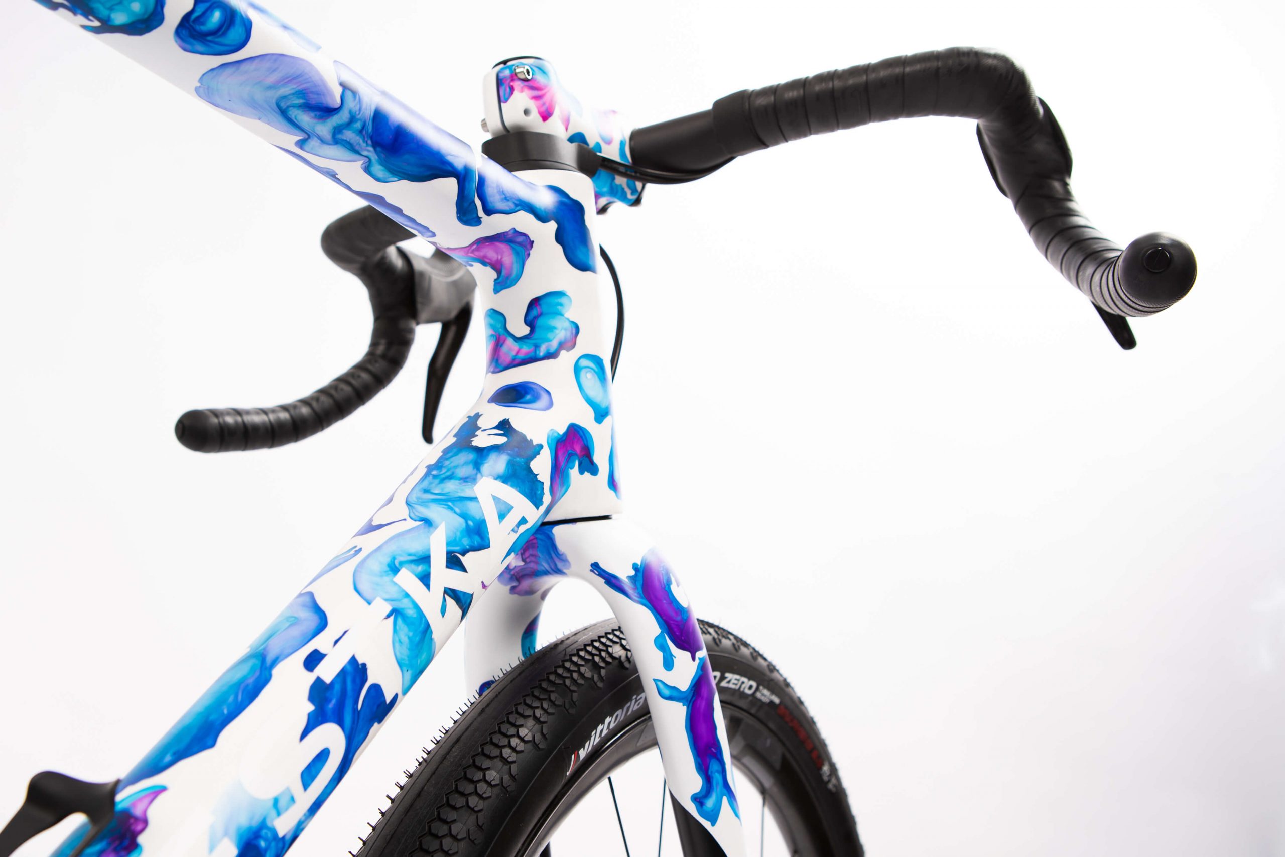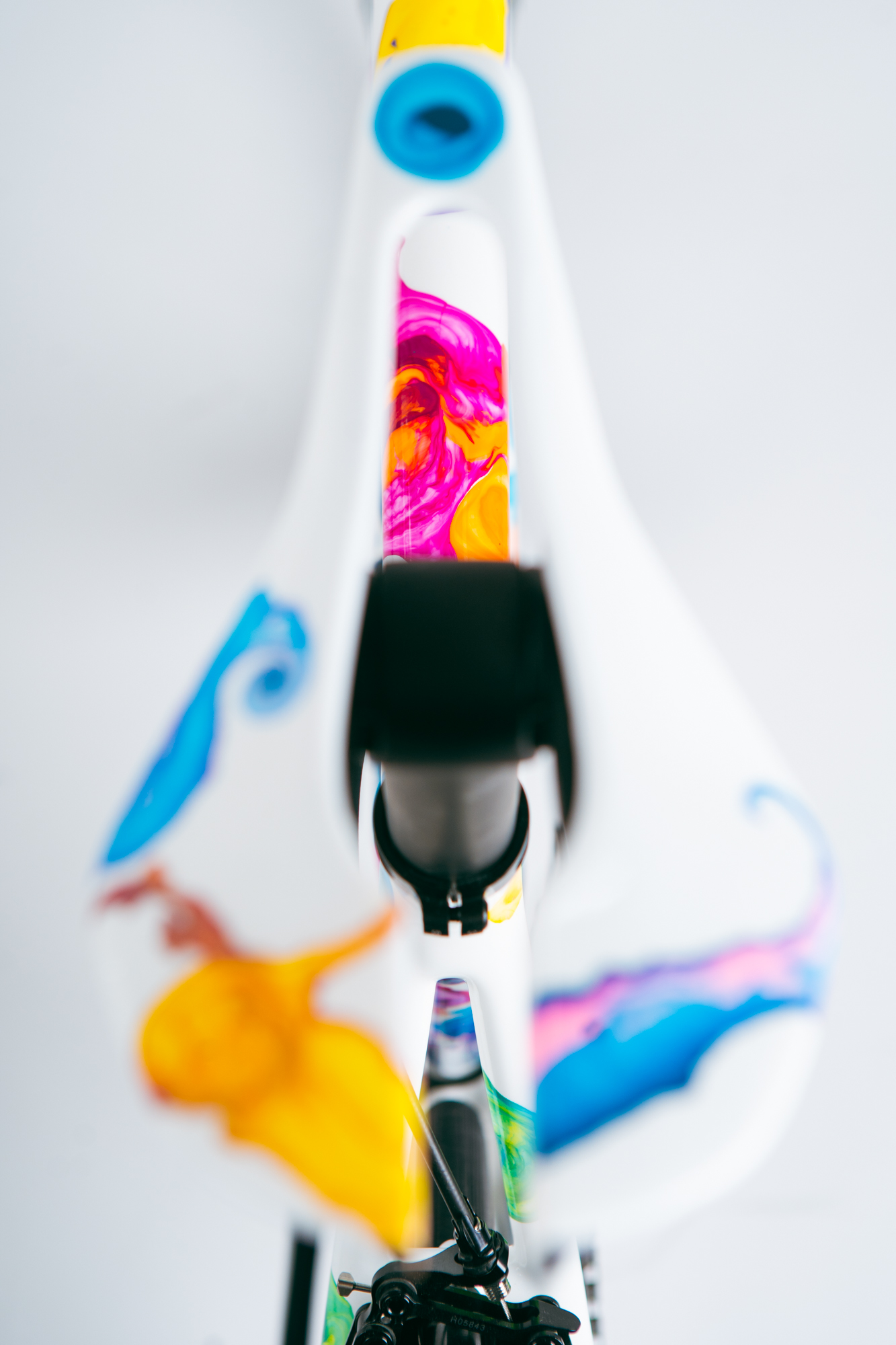 The frames were decorated using a technique that Kašpárek had been working on for about four years. The method consists in producing spectacular abstract paintings composed by organic multicolored shapes onto a white canvas. Even though the first lockdown was something nobody desired, Ondřej had to stop tattooing, which allowed him to join his fellow artist to devote themselves 100% to mastering the method. They had been perfecting the technique for transferring the figures on flat surfaces, which resulted in incredible colors and shapes, but three-dimensional shapes like the frame, fork, stem, or saddle presented an unprecedented challenge for them. Nonetheless, the work is extraordinary, just as if an abstract octopus had squirted rainbow-colored ink onto the frame.