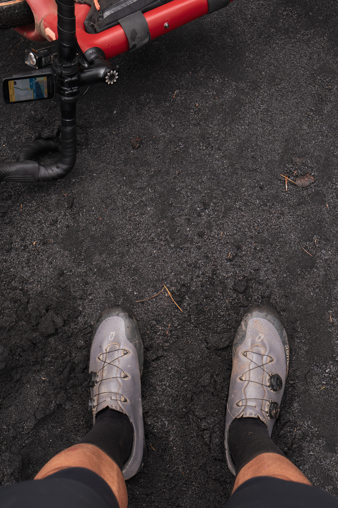 During the previous night’s briefing, we were told there was a 2 km hike-a-bike section, but we didn’t know exactly where. We thought we would be able to ride all of it, as it was technical but still somewhat rideable. However, we had to put our feet on the ground when we hit a sandpit of volcanic ashes. Black sand. We had never thought we would be riding over the traces of a recent eruption, and once again Gravel Ground delighted us with some unique moments.