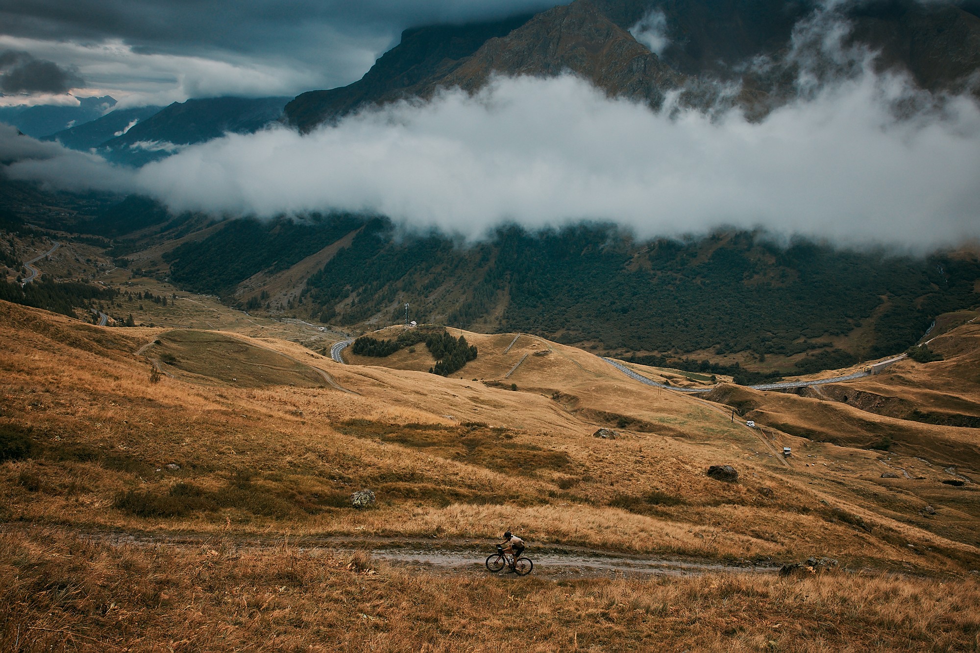 From Briançon we joined the first gravel sections that would take us through small villages and singletracks to finally start the proper gravel climb to the Galibier. Among some drizzle and mist, and just before the Lautaret, it all became real as the slope suddenly went above 10%. We could not see the top, just some random peaks on the sides, but up we went along a challenging, wet, muddy, and slippery gravel path. The wind was blowing and we could feel the rain on our faces and legs, which was slowly soaking us. We all climbed at our pace, which meant a very elongated trail of cyclists.