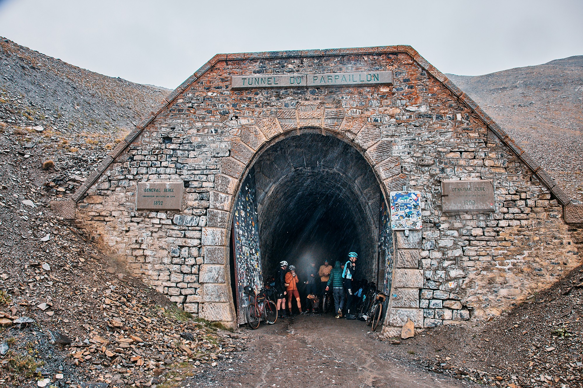 Valentijn and Anna were the first to start riding that day, from 4 a.m., but the first up to the checkpoint in Parpaillon was Martijn, who had bivvied and was the closest. At that moment the weather was just cloudy but not rainy. However, as the rest of the participants started arriving after noon, the weather drastically changed and it would only get worse. Thunder made everyone rush to the top to find shelter in the tunnel, next to the stove, or inside the van to enjoy a warm tea and some snacks. Simon became the savior of the day.
