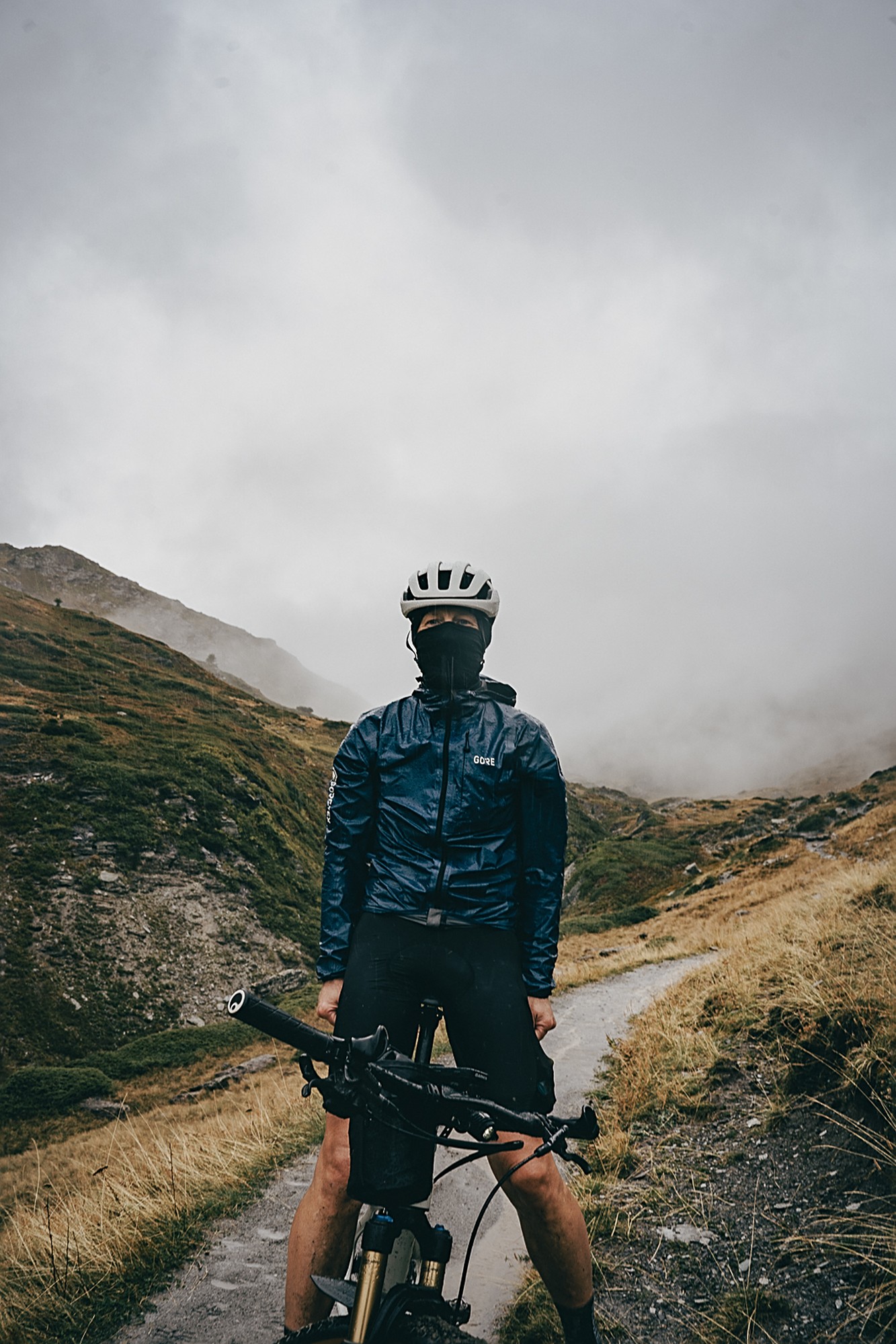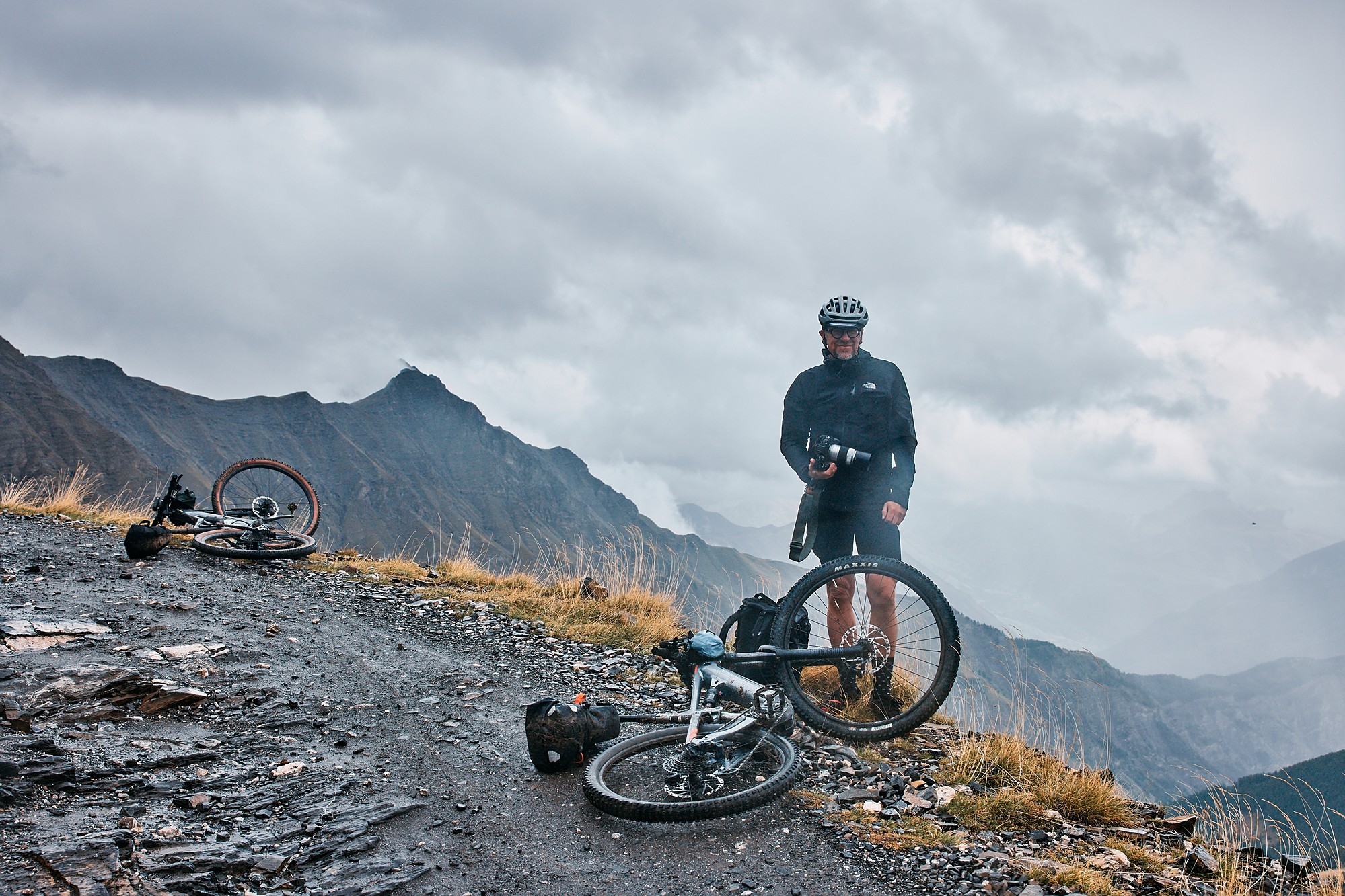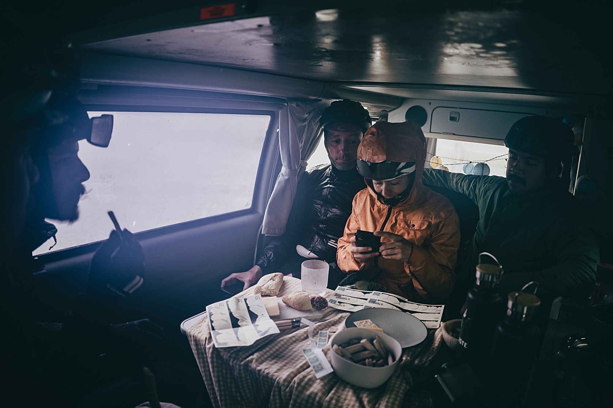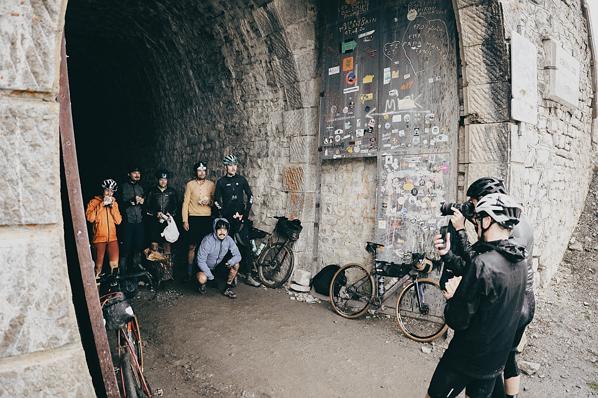 Valentijn and Anna were the first to start riding that day, from 4 a.m., but the first up to the checkpoint in Parpaillon was Martijn, who had bivvied and was the closest. At that moment the weather was just cloudy but not rainy. However, as the rest of the participants started arriving after noon, the weather drastically changed and it would only get worse. Thunder made everyone rush to the top to find shelter in the tunnel, next to the stove, or inside the van to enjoy a warm tea and some snacks. Simon became the savior of the day.
