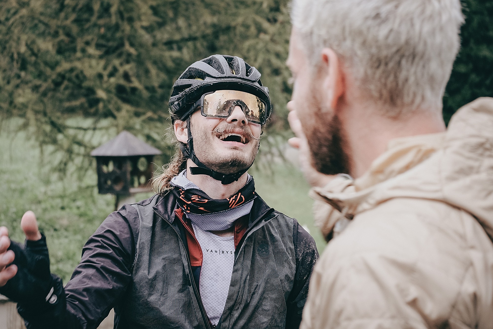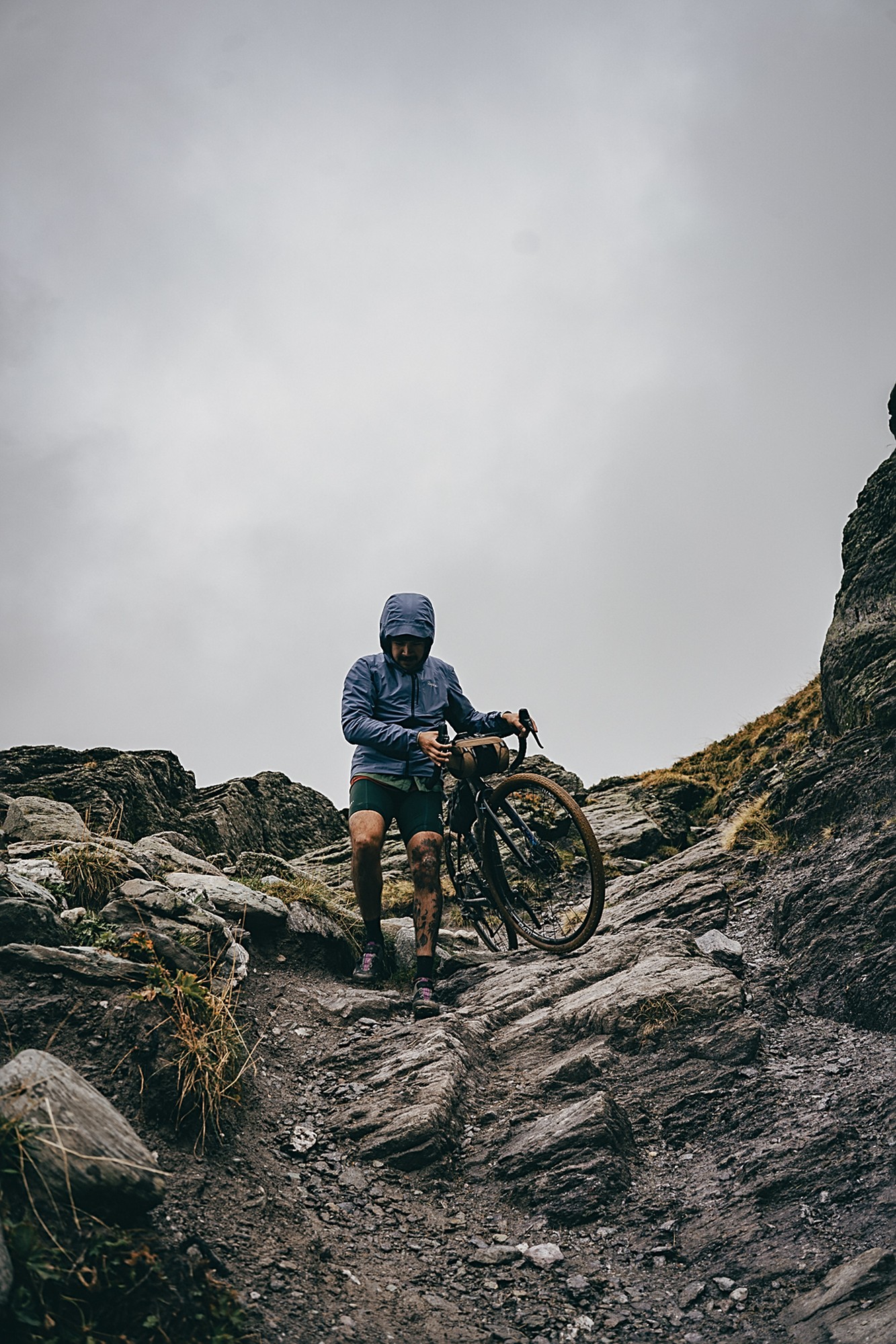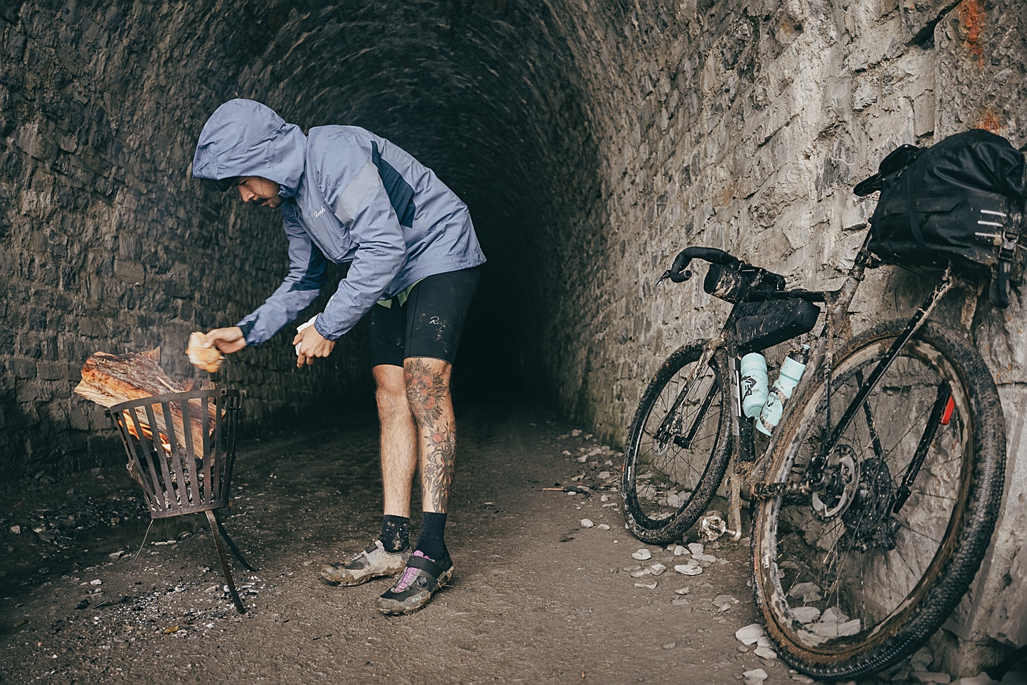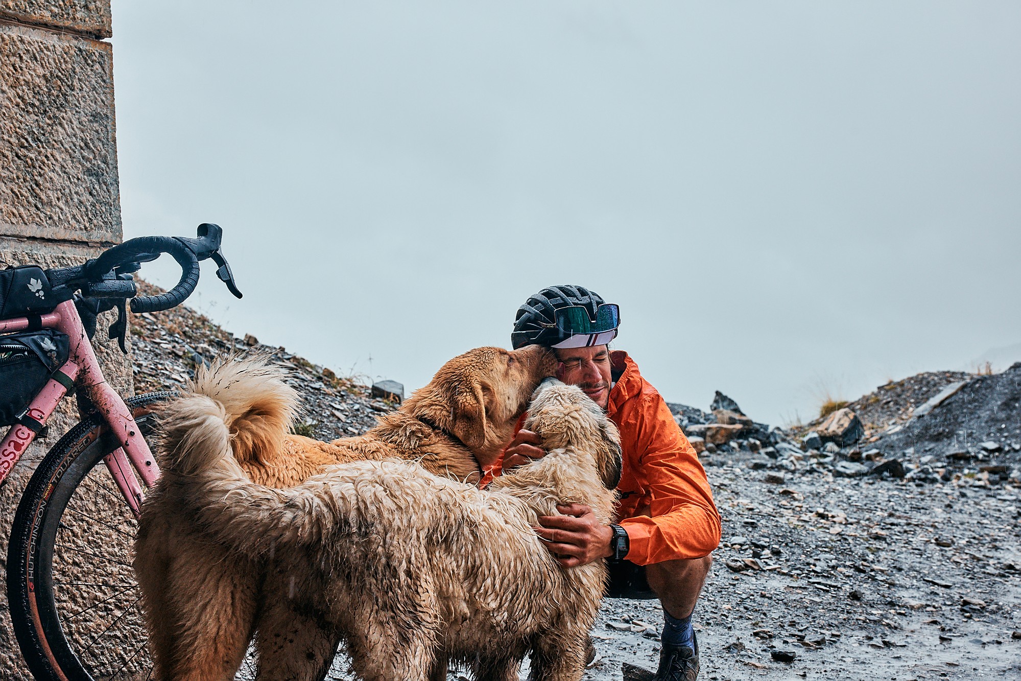 Valentijn and Anna were the first to start riding that day, from 4 a.m., but the first up to the checkpoint in Parpaillon was Martijn, who had bivvied and was the closest. At that moment the weather was just cloudy but not rainy. However, as the rest of the participants started arriving after noon, the weather drastically changed and it would only get worse. Thunder made everyone rush to the top to find shelter in the tunnel, next to the stove, or inside the van to enjoy a warm tea and some snacks. Simon became the savior of the day.