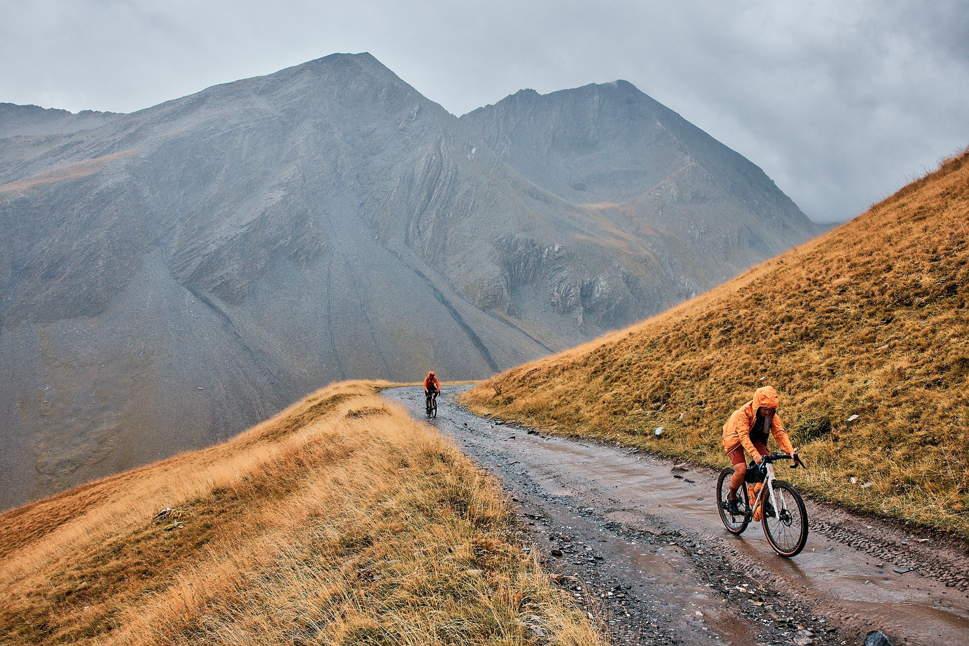 From Briançon we joined the first gravel sections that would take us through small villages and singletracks to finally start the proper gravel climb to the Galibier. Among some drizzle and mist, and just before the Lautaret, it all became real as the slope suddenly went above 10%. We could not see the top, just some random peaks on the sides, but up we went along a challenging, wet, muddy, and slippery gravel path. The wind was blowing and we could feel the rain on our faces and legs, which was slowly soaking us. We all climbed at our pace, which meant a very elongated trail of cyclists.