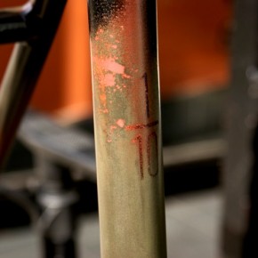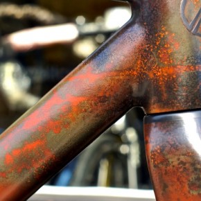 This project was a thought when I started to look for a new frame. So many companies are now building affordable performance track frames and components that simply couldn’t be dreamt of just 5years ago. The Berlin based 8bar bikes caught my attention right away since their frames are well up my alley. Top quality for such a competitive price. When I approached Stefan to see if we could work on something together, he was immediately into it. They released this new Krzberg V5 frame this year and we agreed a stunner like that could handle a paint job that really made a statement. That paint job was quite a challenge to unite rust and camouflage and not have both elements compete or cancel each other out.