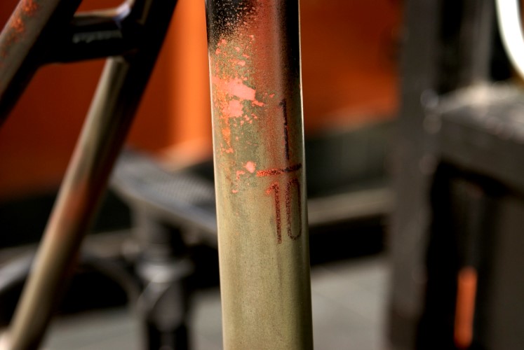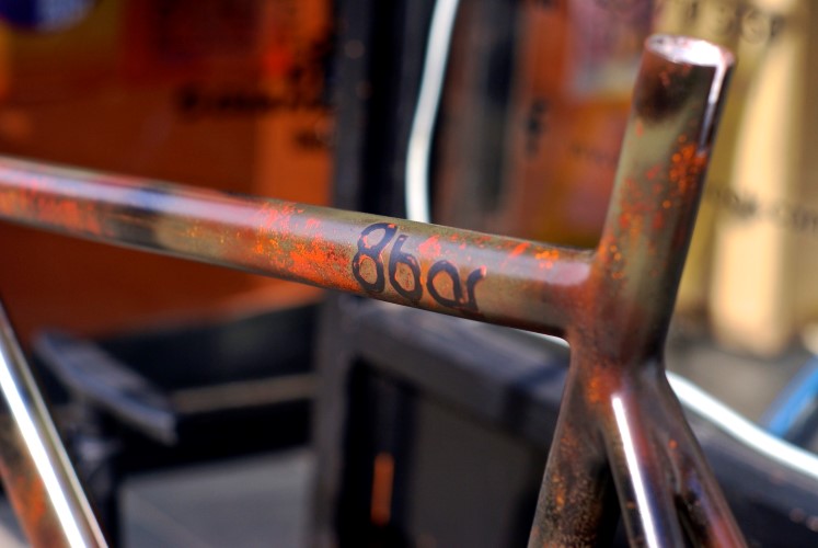This project was a thought when I started to look for a new frame. So many companies are now building affordable performance track frames and components that simply couldn’t be dreamt of just 5years ago. The Berlin based 8bar bikes caught my attention right away since their frames are well up my alley. Top quality for such a competitive price. When I approached Stefan to see if we could work on something together, he was immediately into it. They released this new Krzberg V5 frame this year and we agreed a stunner like that could handle a paint job that really made a statement. That paint job was quite a challenge to unite rust and camouflage and not have both elements compete or cancel each other out.
