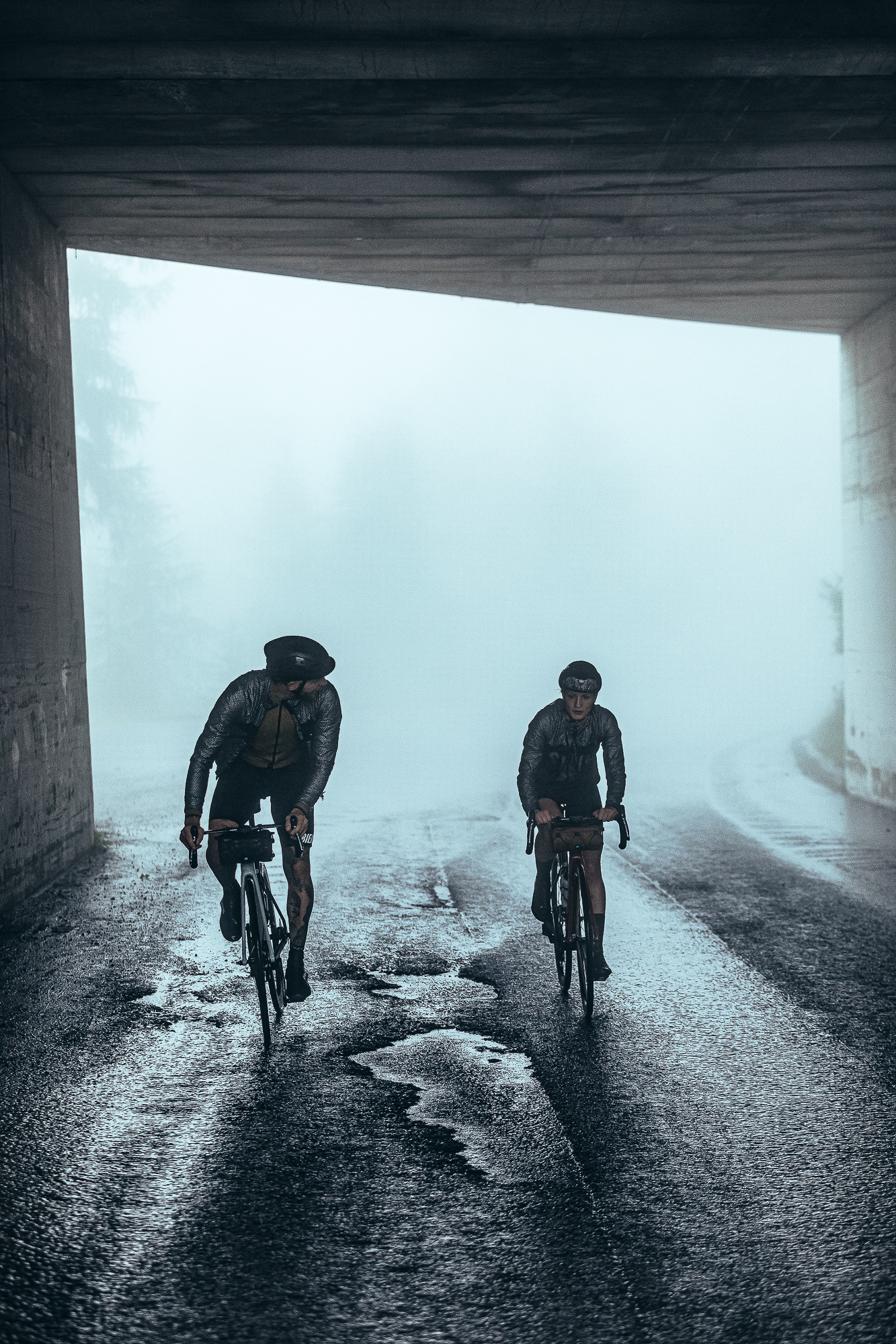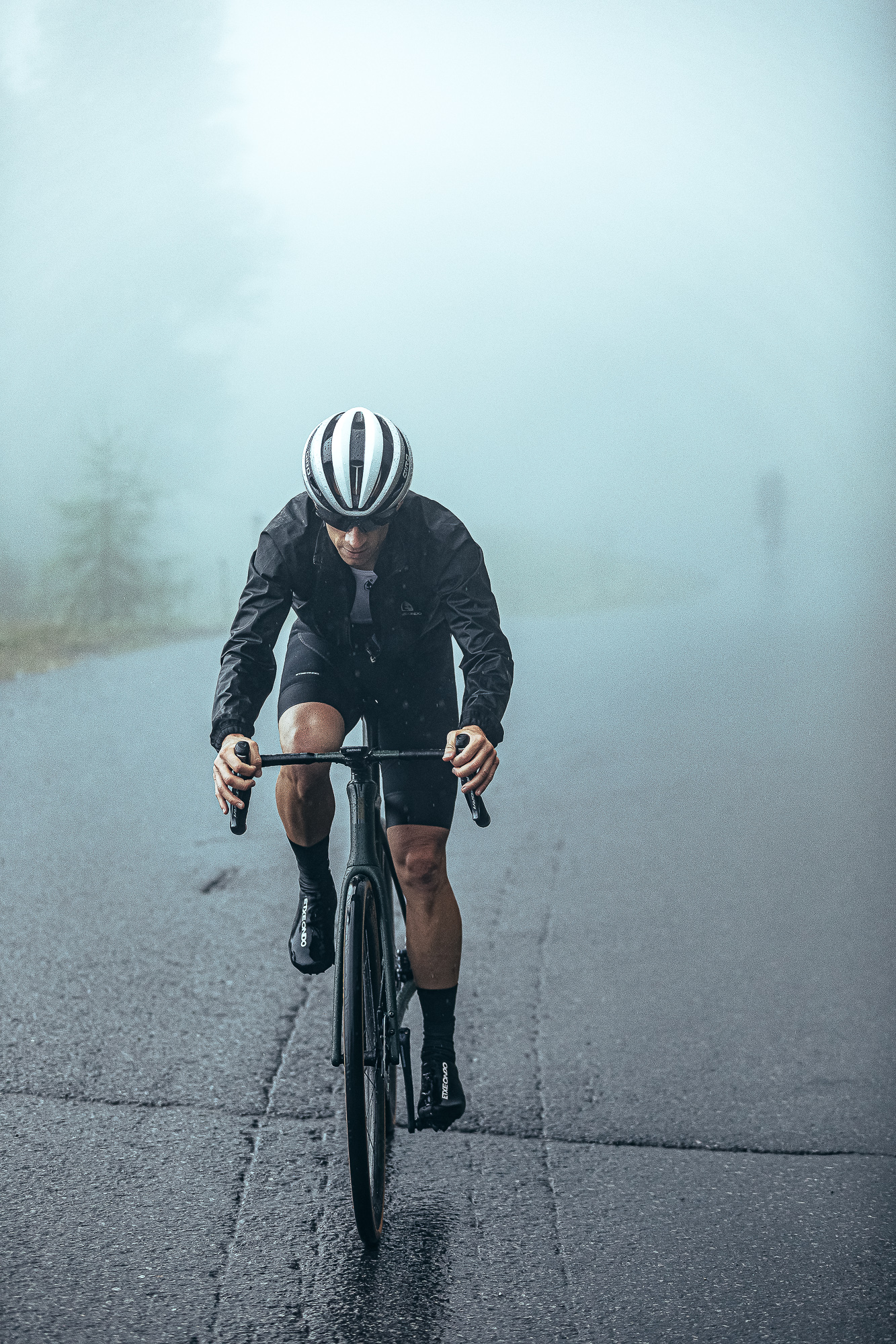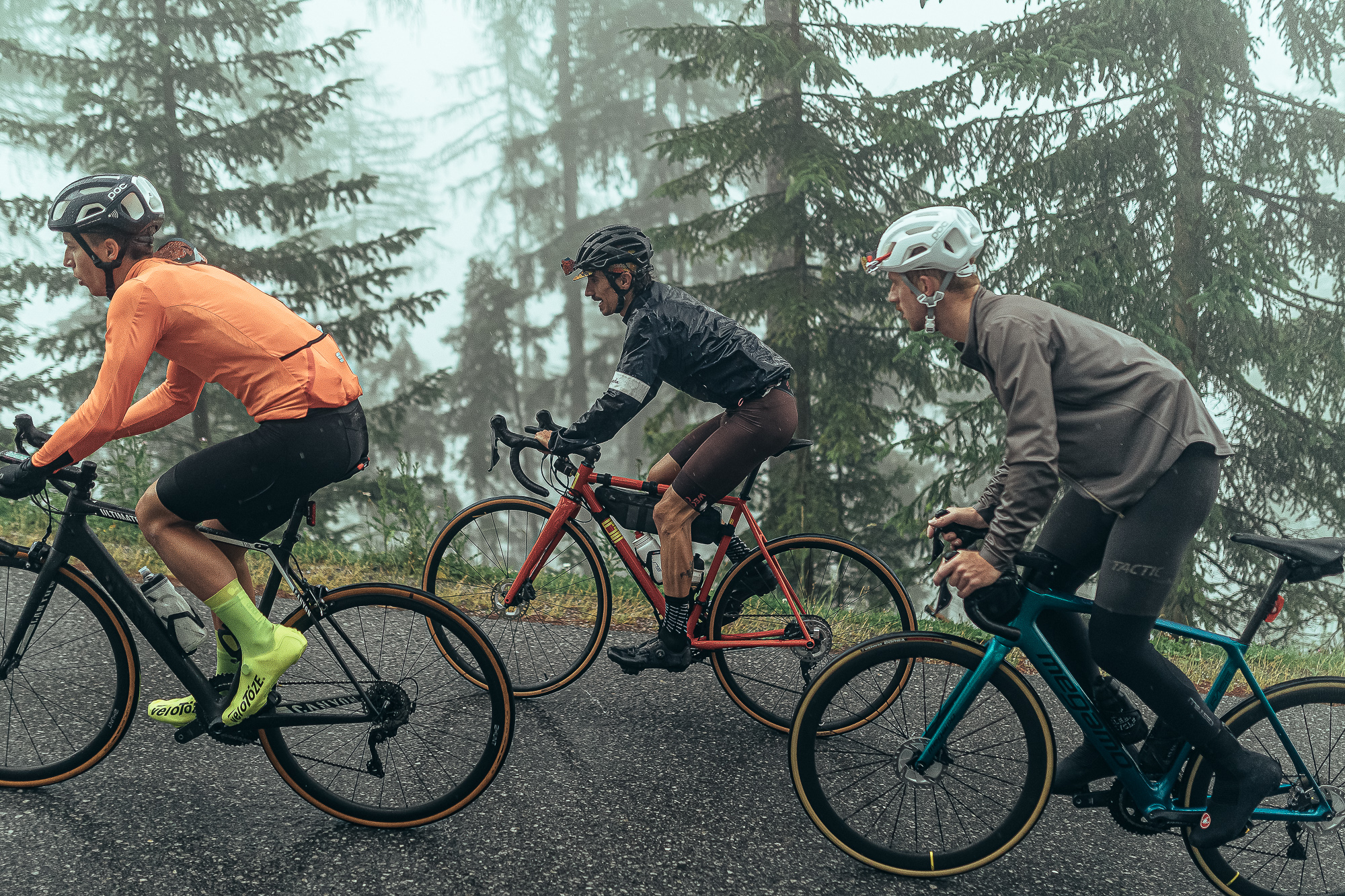 The rain didn’t stop during all the climb, and despite the fact that we could not see the landscape because of the fog, we got a glimpse of the first “giants” in between the haze. At the start, the gradient was around 13%, and only two short false flats in the entire climb allowed us to take some rest. We quickly realized which of the participants was at a similar level to us, and the pack split into smaller groups.