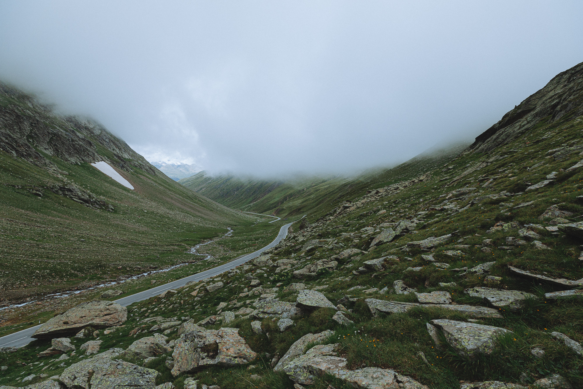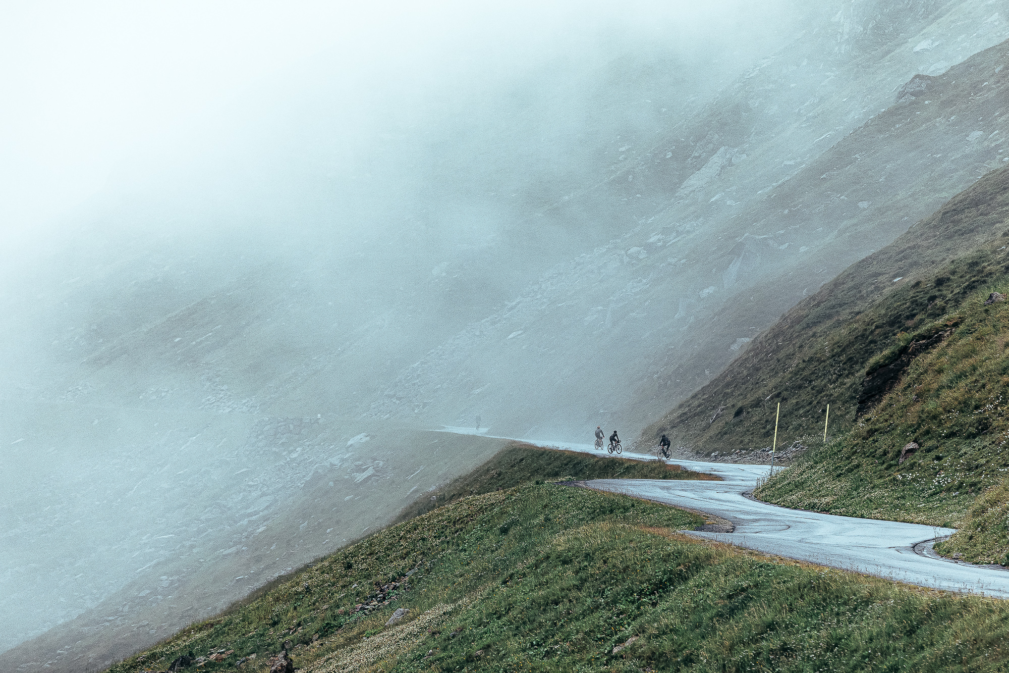 The top was getting closer, but the fog around us did not allow us to see where we were going. Each of the last switchbacks had a sign showing the altitude we were at, so knowing that the highest point of the Timmelsjoch is located at 2.509 m of elevation, we could only guess what was left.