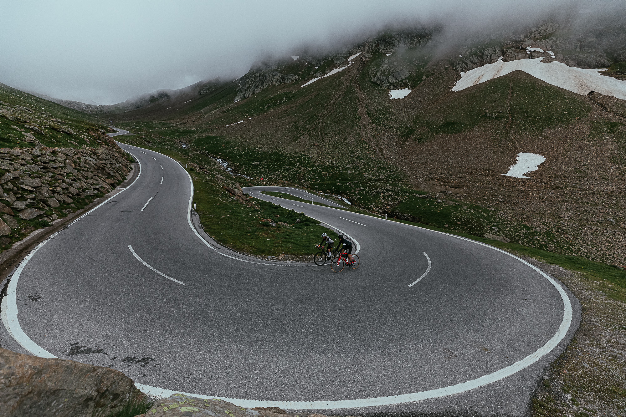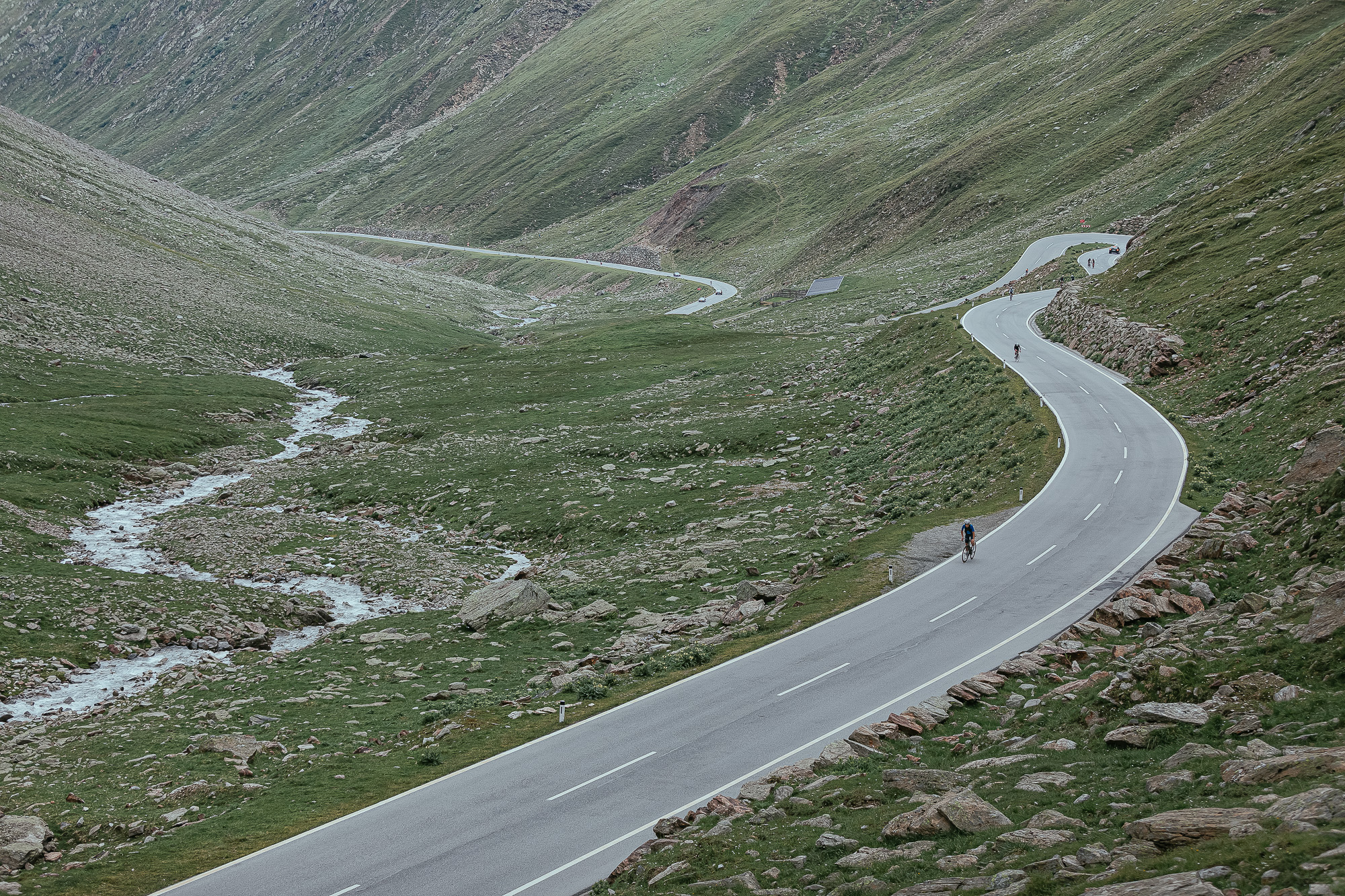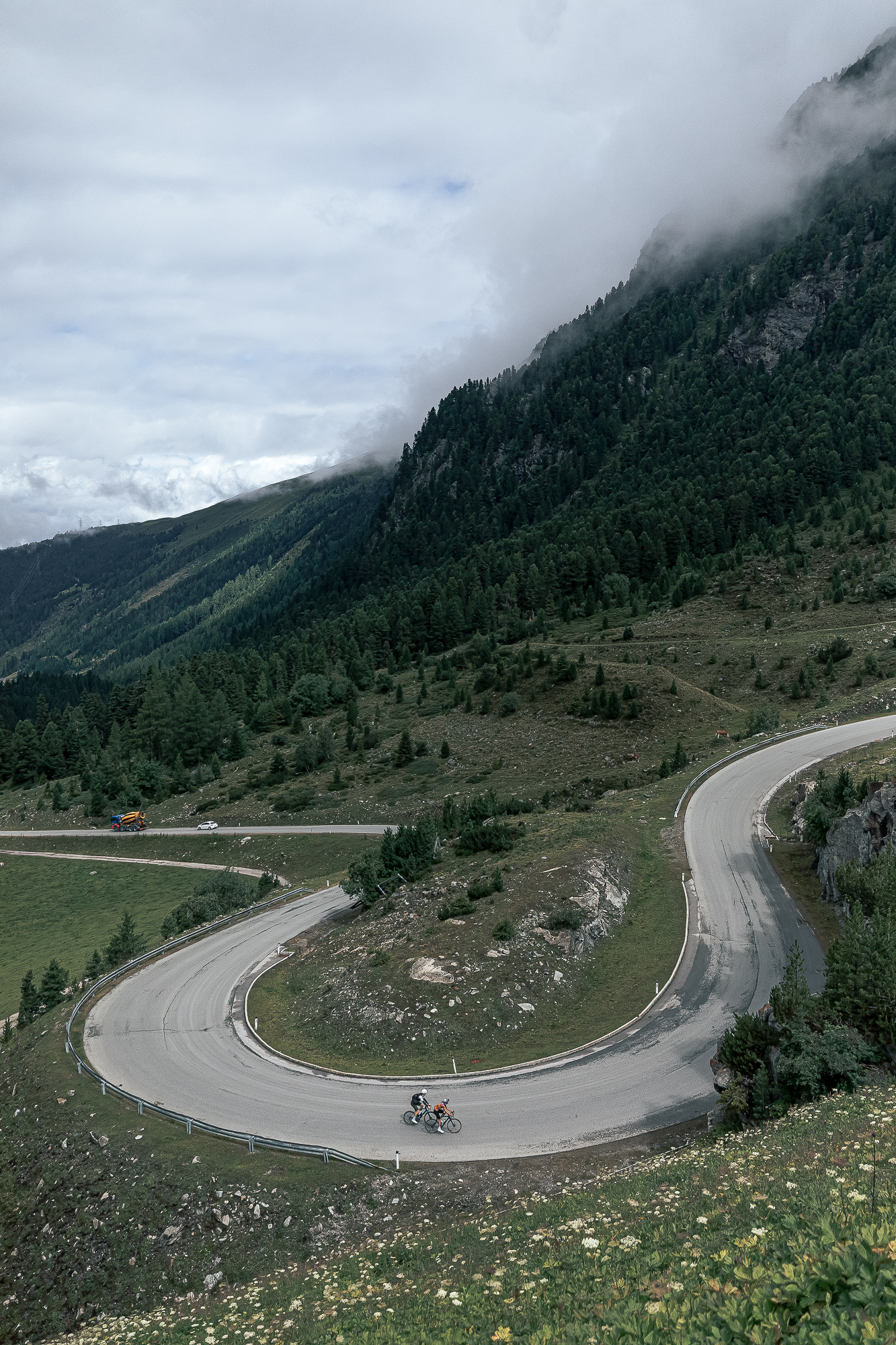 Halfway to the 25 km climb, we arrived at a toll with a big lookout spot. There, the views of the valley were superb and allowed us to see all we had climbed so far. However, there was still a big part left. From the toll, we descended a bit, and all of a sudden the last part of the Timmelsjoch pass appeared in front of us like a wall, making us feel tiny. We could not see the top, which was hidden behind some clouds, but the twisty road leading to it.