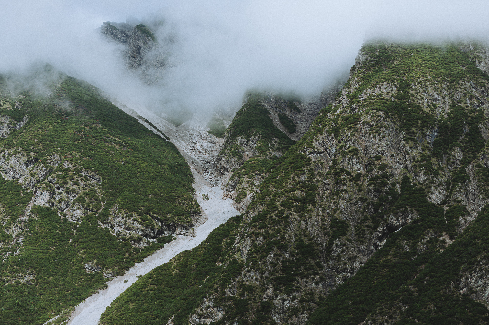 Once down, the rain had stopped but the clouds still covered the sky, threatening us as we continued heading south. We went through some villages and tunnels that gave us the sensation of shelter. The Venter Acher river was flowing next to us for the following kilometers, and led us the way to our turning point, an interesting suspension bridge a few kilometers beyond the picturesque village of Vent.