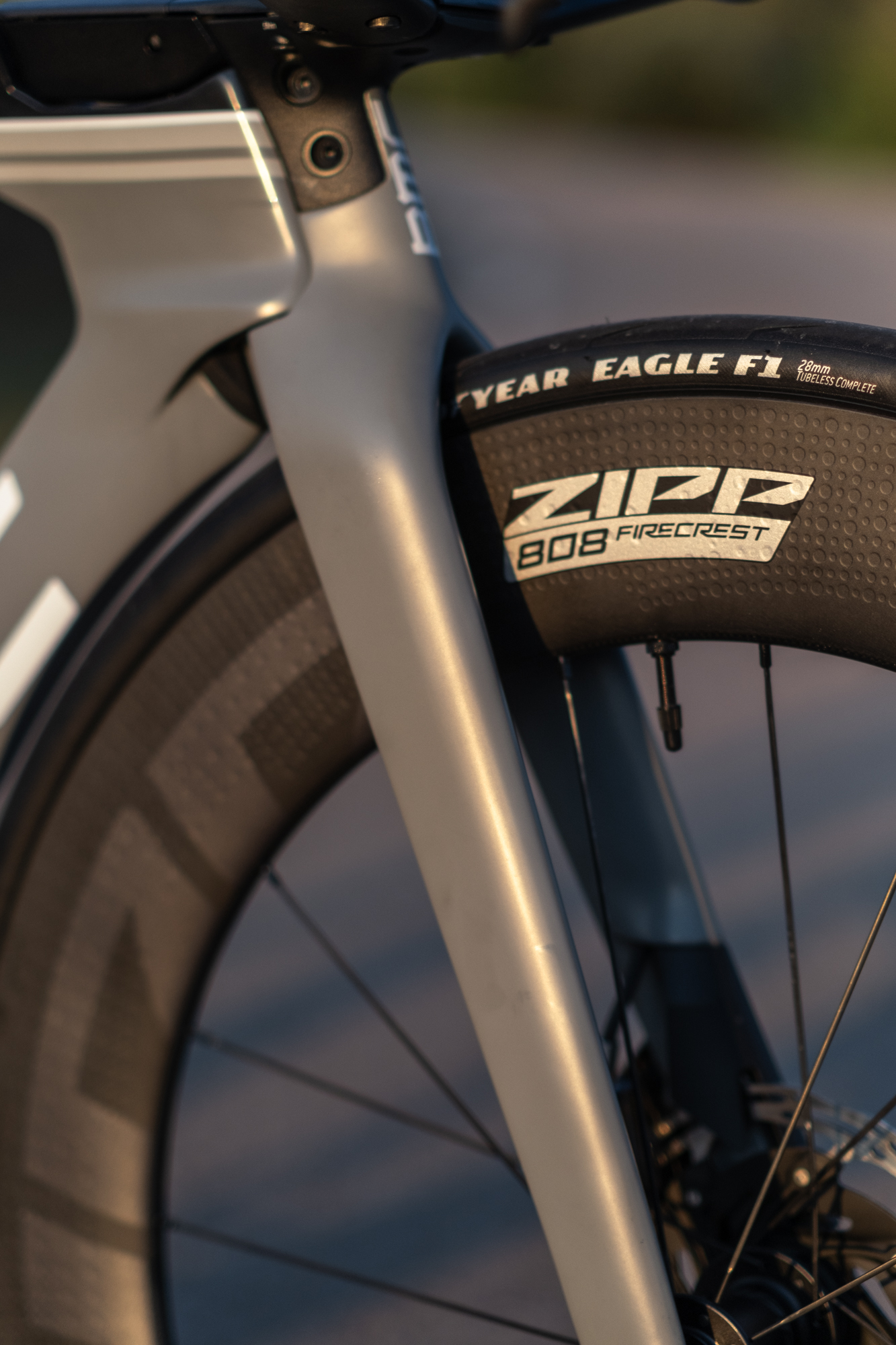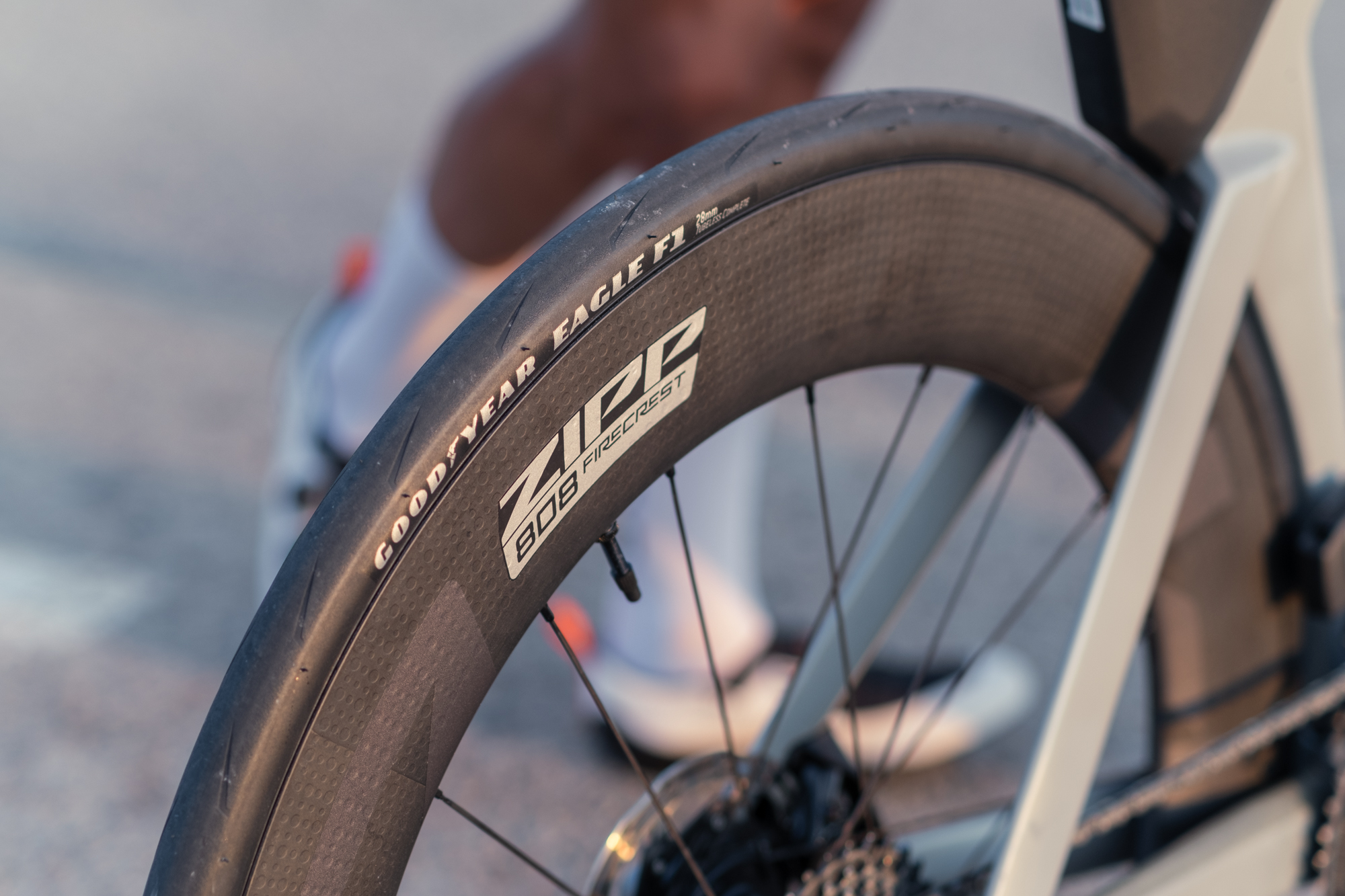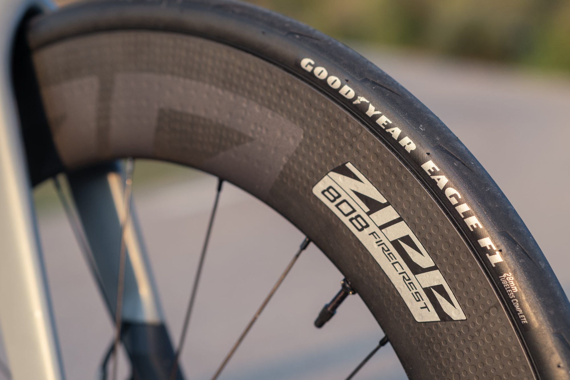 We tested the Zipp 808 Firecrest, which are designed with a hookless and tubeless rim profile. These wheels have a rim depth of 80 mm and an inside width of 23 mm.